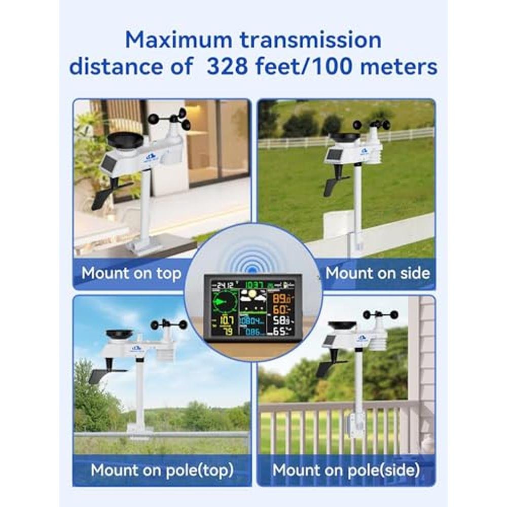 10-in-1 Wireless Weather Station, featuring functions including indoor and outdoor wireless sensors, rain gauge, wind speed/wind direction, moon phase, barometer, indoor temperature/humidity, weather forecast, etc. Its transmission range is up to 328 ft/100 meters.