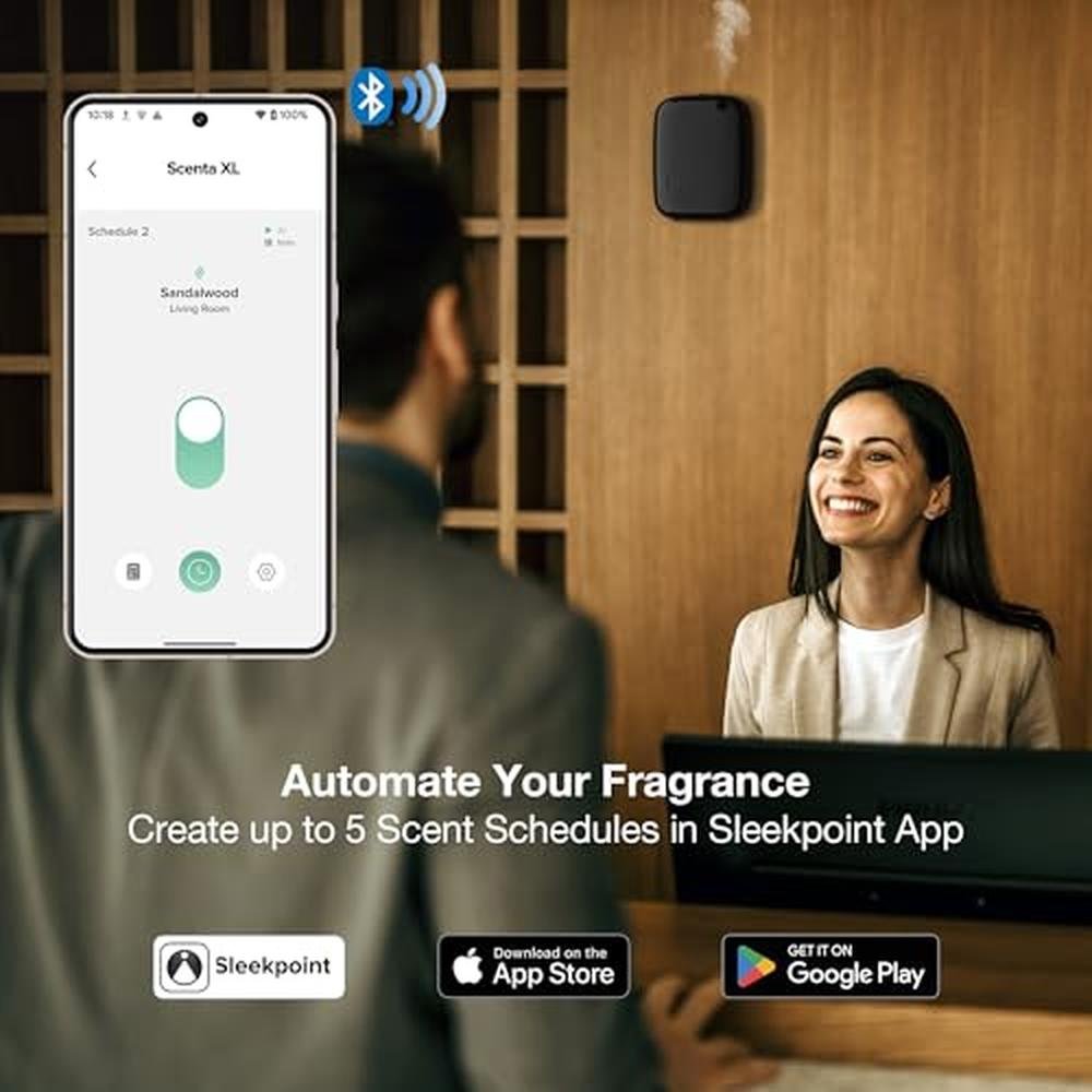 - Smart Control: Seamlessly manage settings via Bluetooth and the Sleekpoint App (iOS/Android) to schedule up to 5 diffusing scenes, adjust timers (3 sec - 5 min), and control fan speed for customized ambiance.