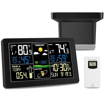 - Multi-functional and Stylish Weather Station --- This home weather station provides extensive information, including rainfall measurement, indoor/outdoor temperature and humidity, air pressure history, moon phase display, weather forecast and trend tracking, outdoor index monitoring, and more. Additionally, it features a dual alarm clock with snooze function and calendar for practical everyday use.
