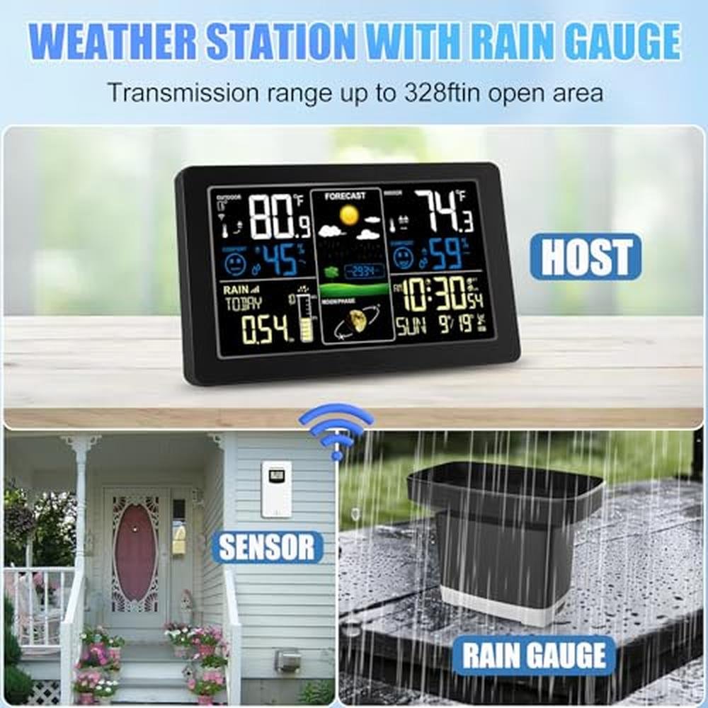 - Weather Station with Rain Gauge --- This multi-function weather station includes a self-emptying and maintenance-free wireless rain gauge outdoor, setting it apart from other weather stations. This feature allows for accurate measurement of rainfall, keeping you informed about precipitation levels around your home. Monitoring rainfall enables optimal watering schedules and helps identify potential flood and hazardous driving conditions.