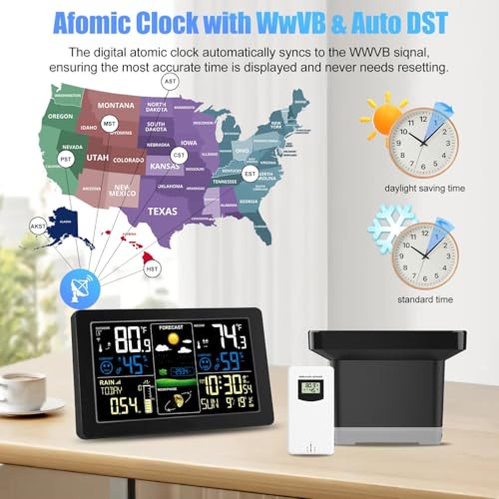 - Home Weather Station Atomic Clock with WWVB Function --- The weather station with digital rain gauge outdoor features with WWVB and an auto DST function. It automatically calibrates daily to provide easy access to accurate clock and date information. If the WWVB signal around your house is weak, you also have the option to set it manually.