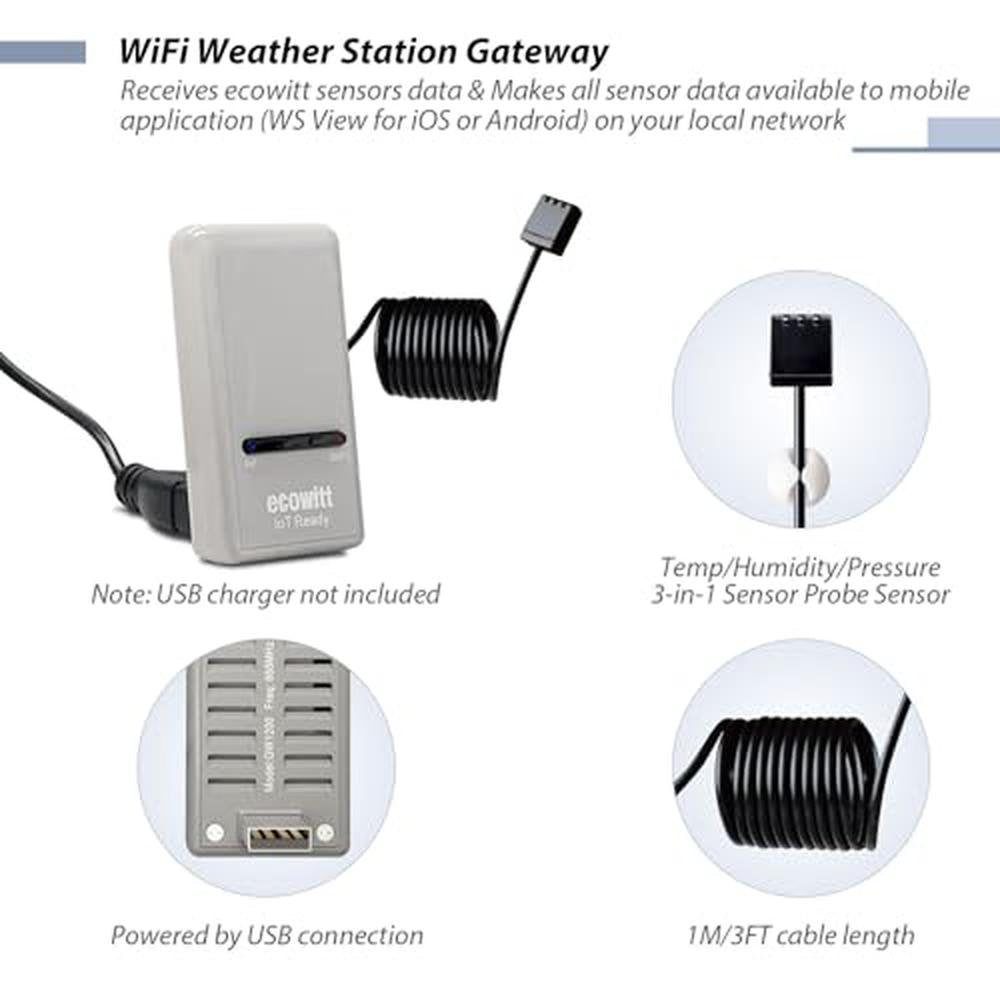 - ECOWITT Wi-Fi Gateway Weather Station: With bulti-in temperature, humidity, and barometric pressure 3-in-1 sensor, the Ecowitt GW1200 Wi-Fi gateway could not only be an indoor weather station but also be a Wi-Fi gateway to connect to Ecowitt all developed sensors/subdevices. An additional 1.5m/3ft USB extension cable for powering the gateway, allowing you to measure more accurate values at any location.