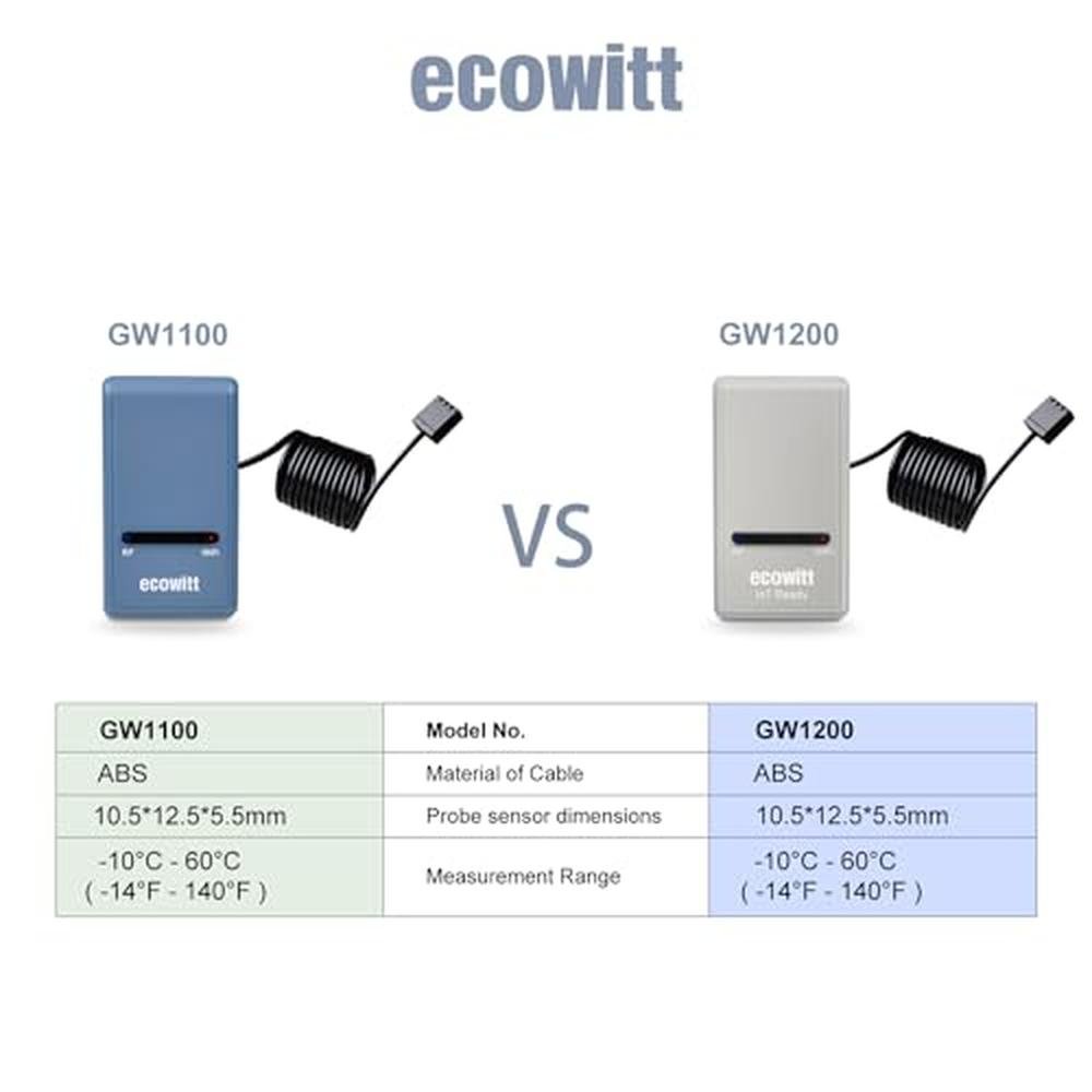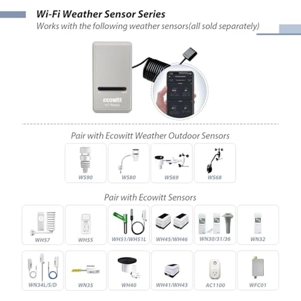 - Various Sensors Supported: GW1200 WiFi weather station gateway can collect sensor data from various Ecowitt-developed sensors(sold separately), such as WN32 outdoor temperature and humidity sensor, WH40 rain gauge sensor, WS68 wireless anemometer, WS90 outdoor sensor array, up to 8 WN31 thermo-hygrometer sensors, up to 8 WH51/WH51L soil moisture sensors, up to 8 WN34L/WN34D pool thermometers, up to 4 WH41/WH43 PM2.5 air quality sensors, WH45/WH46 air quality sensor, WH55 Water leak sensors, and WH57 Lightning sensor, up to 16 Iot devices, such as WFC01/AC1100.