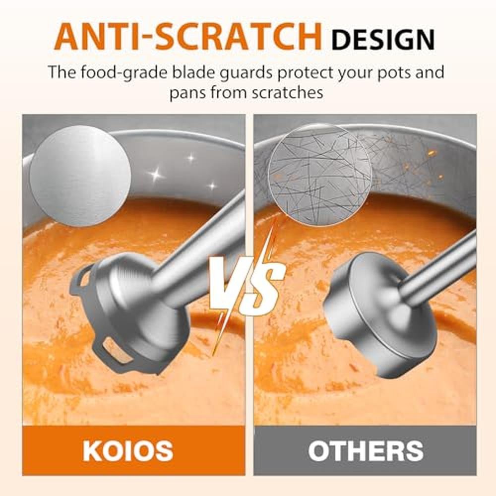 - The KOIOS Immersion Blender features a 1000W anti-scratch 3-in-1 hand blender design with a 12-speed stainless steel blade for efficient blending