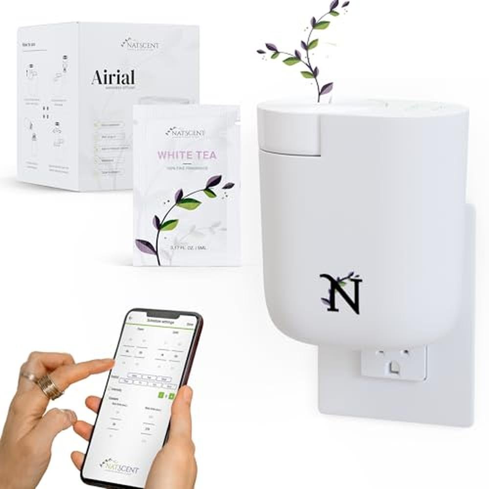 Discover the serene ambiance of the Natscent Airial Plug-in Essential Oil Diffuser, a revolutionary device that brings a touch of luxury to your home or office. This innovative plug-in diffuser utilizes advanced waterless cold-air technology to effectively release a gentle mist of fragrance, providing a refreshing atmosphere that's perfect for relaxation or productivity. With Bluetooth connectivity and a user-friendly app, you can control the diffuser's intensity and customize your scent experience with ease. The Natscent Airial Plug-in Essential Oil Diffuser comes with a complimentary white tea sample and can cover up to 300 sq. ft, making it an ideal solution for small to medium-sized spaces. Experience the luxury of an upscale 5-star hotel right inside your living room, bedroom, or office with our affordable scent diffusers for home and hotel collection diffuser oil and essential oils set.