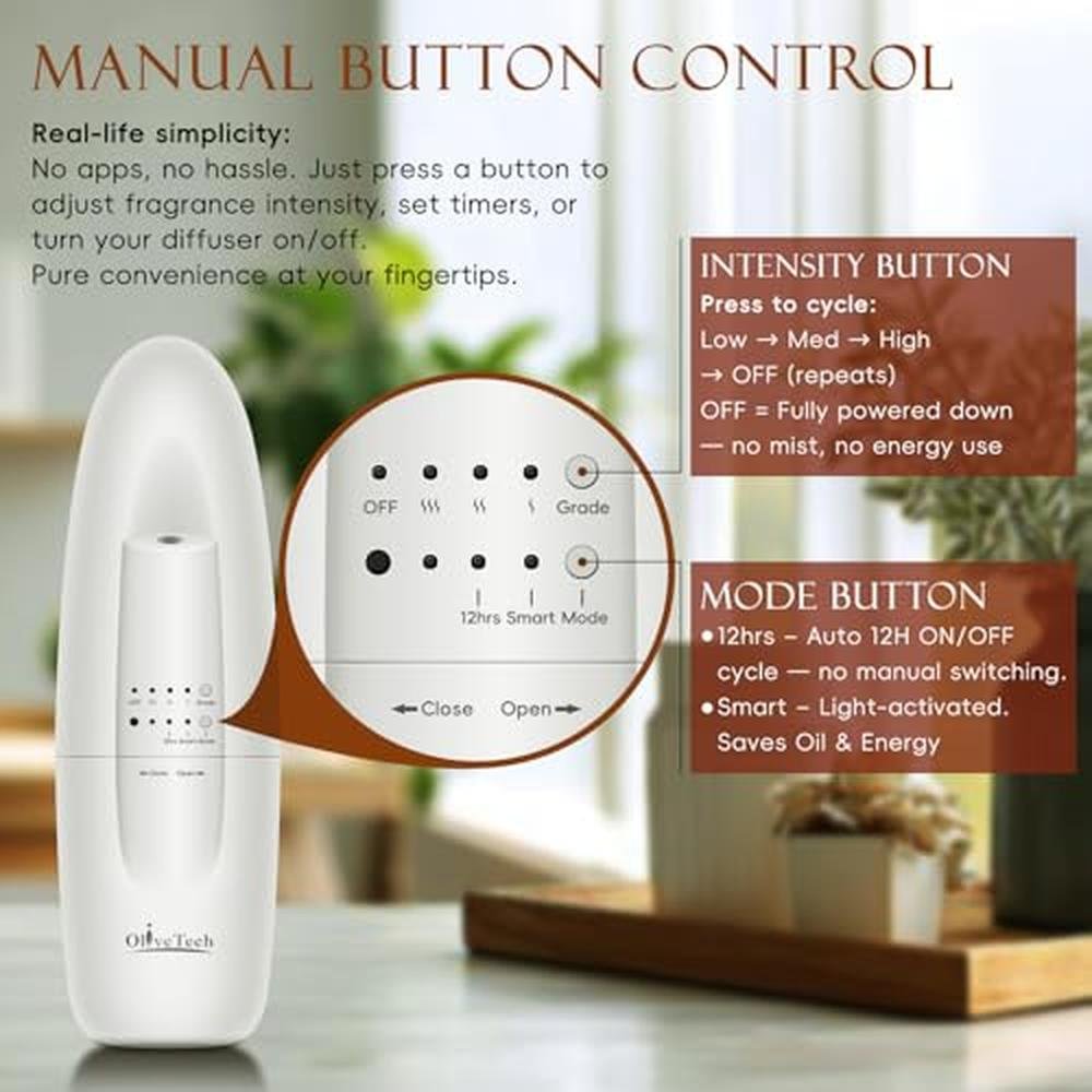 OliveTech's plug-in fragrance diffuser fills small and medium rooms with a clean, pleasant fragrance that helps you relax, lift your mood, and enjoy a truly welcoming atmosphere. With its powerful and easy-to-use design, this scent diffuser is the perfect addition to any space. Advanced cold-air, waterless diffusion technology ensures no spills, no leaks, and no mess, making it safe for children and pets. Plus, with no complicated setup or apps required, you can simply add oil, plug it in, turn it on, and enjoy the benefits of aromatherapy. Our hotel-inspired fragrance oils are crafted with clean, safe ingredients, free from parabens, phthalates, and harmful chemicals, ensuring a luxurious and inviting atmosphere in every room.
