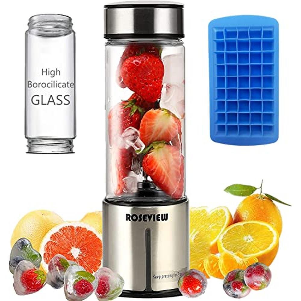 Immerse yourself in the world of premium portable smoothie blenders with the ROSEVIEW Glass bottle USB rechargeable mini handheld blender, a top-tier choice for creating exquisite and healthy drinks on-the-go. As one of the finest portable blenders for smoothies, this sophisticated 2-speed blend juicer boasts a stainless steel design and a cordless, rechargeable battery, making it perfect for travel, outdoor adventures, and fitness enthusiasts. With its compact size and lightweight design, this upscale portable smoothie blender bottle is a must-have for busy individuals seeking easy and convenient ways to make delicious smoothies. Whether you're looking for portable smoothie recipes for weight loss or just want a high-performance blender for making premium smoothies, the ROSEVIEW portable smoothie maker is an ultimate choice. Elevate your smoothie game with this advanced, premium-grade blender that features a high-quality glass bottle and a powerful motor for effortless blending. Explore the world of limitless smoothie possibilities with the ROSEVIEW portable smoothie blender, designed to redefine your blending experience.