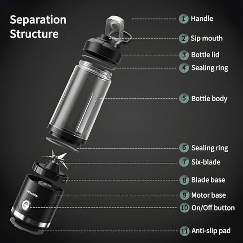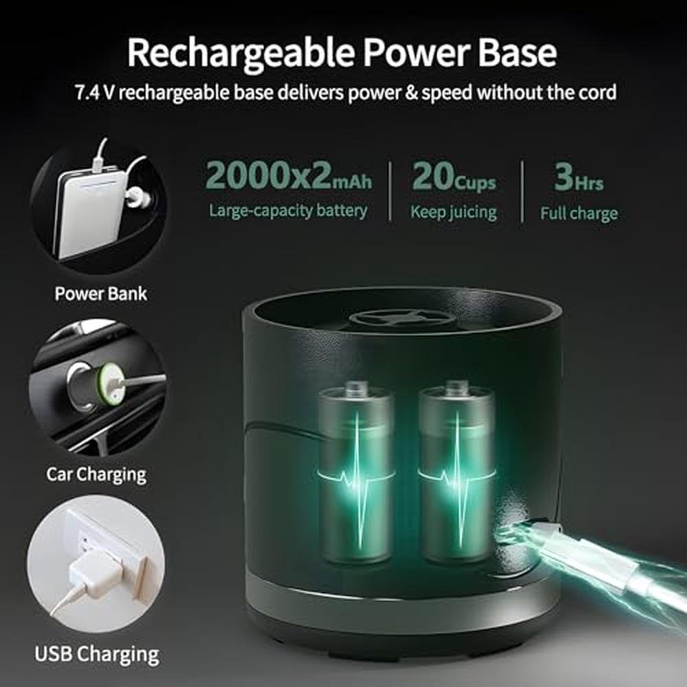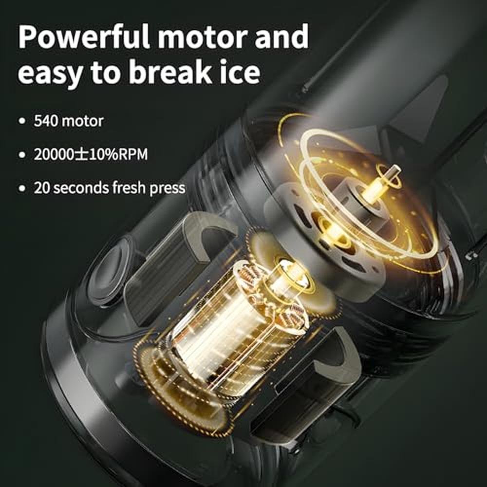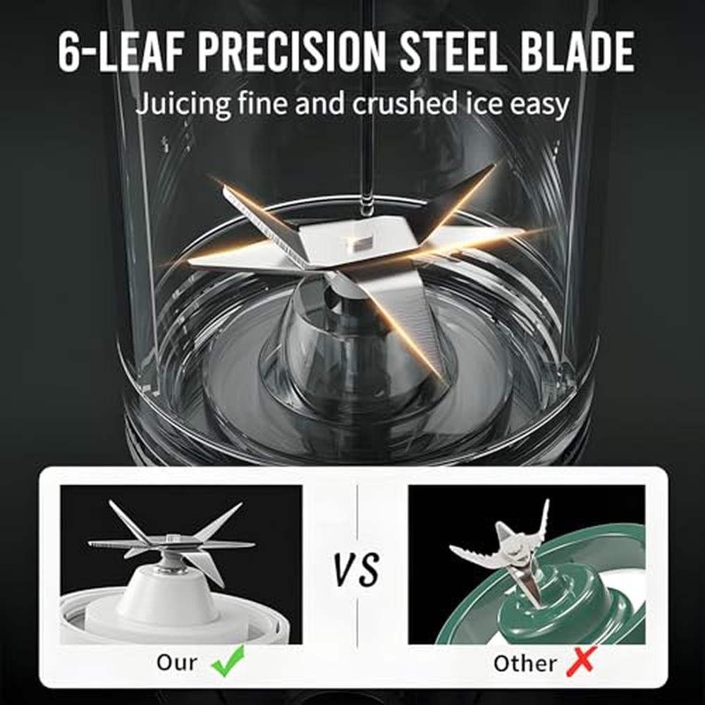 This sophisticated portable juicer cup features powerful stainless steel blades to easily crush ice and blend fruits for smoothies, juice, and protein shakes. Detachable parts for easy cleaning (dishwasher safe, motor base excluded) with a safety lock ensuring operation only when fully assembled. Wireless USB-C charging for long-lasting use, with a portable handle and one-touch flip lid, detach the base to take on the go. Food-grade BPA-Free material, lightweight and compact, your go-to companion for healthy drinks anytime, anywhere.