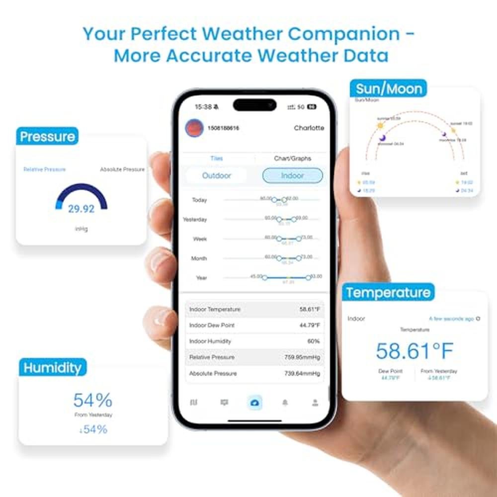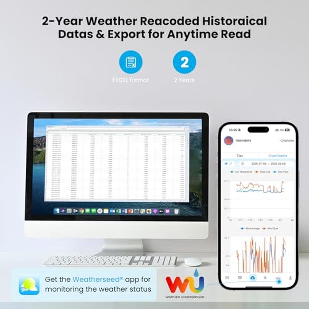 - WiFi + Weatherseed App + WU + 24/7 AI Forecast & AlertsConnect to the Weatherseed APP via 2.4GHz WiFi, with the optional integration of Weather Underground (WU) service. The AI algorithm provides 24/7 weather monitoring and high-precision forecasting, and real-time pushes accurate alerts for sudden changes in temperature, humidity, and air pressure, providing decision support for home protection, gardening management, or outdoor adventures.Only 2.4G WiFi