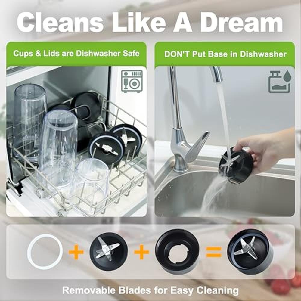 Elevate your blending game with our 1200W personal blender, featuring ice-crushing power, dual removable blades, and three BPA-free portable cups. Perfect for smoothies, shakes, frozen drinks, coffee grinding, and baby food, this blender is a versatile addition to any kitchen. With 25,000 RPM and auto-lock safety, it effortlessly crushes ice and tough ingredients. The self-cleaning feature and dishwasher-safe parts make maintenance a breeze, allowing you to blend anytime, anywhere with ease.