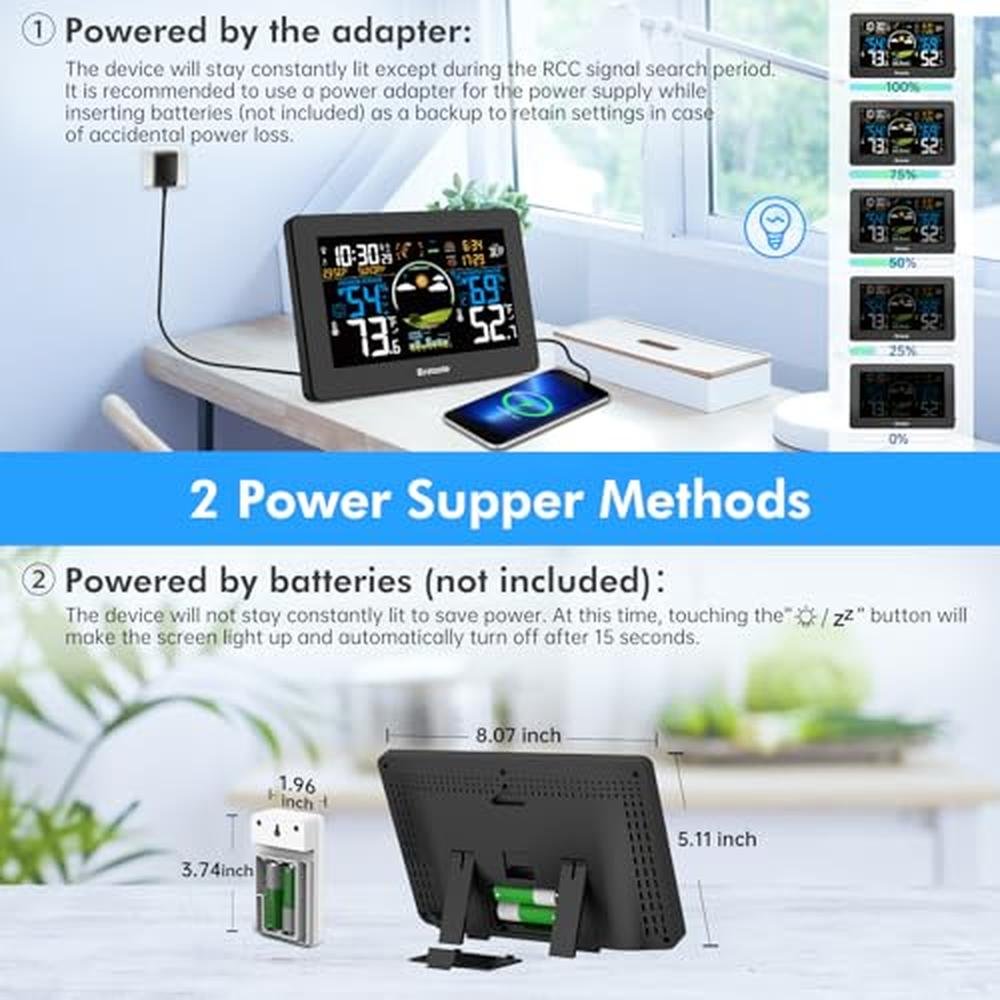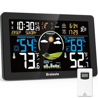 • 7.5'' Large HD VA Screen: The upgraded Brataste weather station features a 7.5-inch high-definition VA screen, which provides a clearer display and higher contrast, and is more energy-efficient than LCD screens. The screen can also be set to 5 different brightness levels based on personal preference, which allows the temperature, humidity, date, weather forecast and other useful data to be obtained with a quick glance at the screen.
