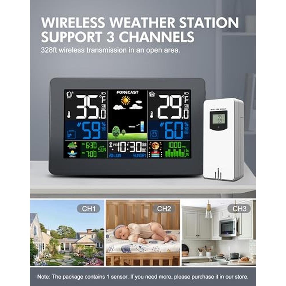 - Multi-location Weather Monitoring: With the latest quick connection technology, the host can connect to up to three sensors, allowing for a wireless transmission distance of up to 328 feet, making it easy to achieve multi-point weather monitoring throughout the house.