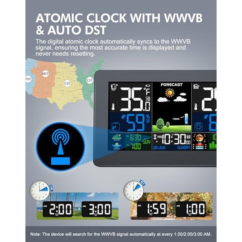 - Atomic Clock & DST Function: The weather station supports multiple time zones (HAT, AKT, PST, MST, CST, EST, AST) and features an atomic clock that automatically syncs daily with auto signals for accurate timekeeping. Before enabling the atomic clock function, please ensure that the time zone settings are correct to prevent any synchronization errors. You can also set it manually if the signal around your house is weak.