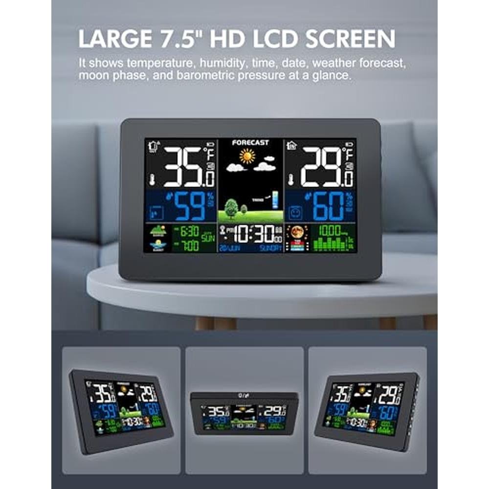 - Excellent Visual Experience: This home weather station offers an amazing visual experience with its 7.5-inch HD screen. The display interface is carefully optimized to ensure high contrast and a comfortable viewing experience. Clear categorization of information and soft colors make it easy to read key details such as temperature, humidity, weather forecasts, time, and date. It is designed to be suitable for all ages, making it an indispensable companion for every household.