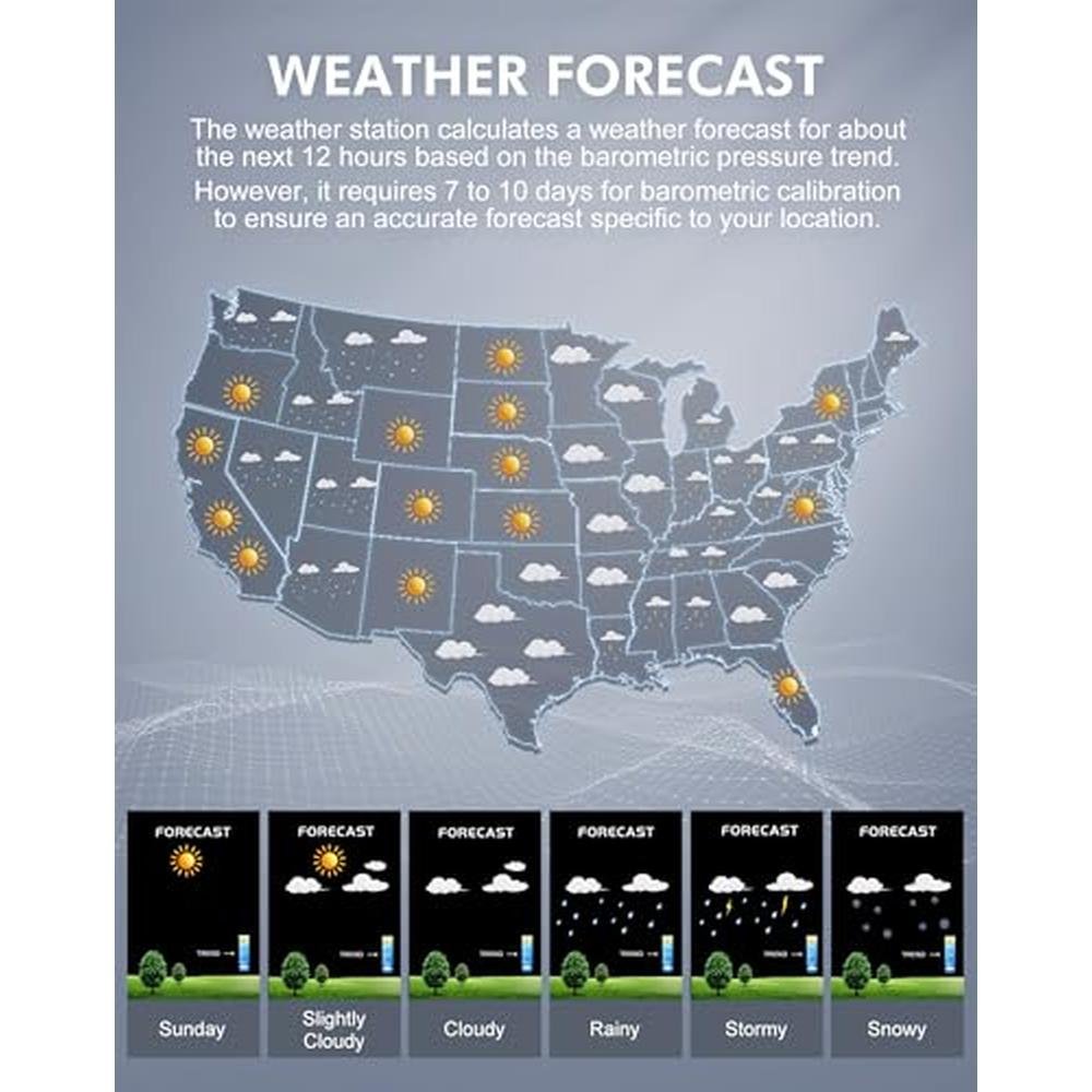 - Weather Forecast: In addition to basic temperature and humidity information, this wireless weather station also allows you to plan your day with a more comprehensive weather forecast for your area. It calculates the forecast for an 8- to 12-mile radius around your home based on barometric pressure trends. However, barometric pressure calibration requires 7 to 10 days to ensure an accurate forecast for your location.