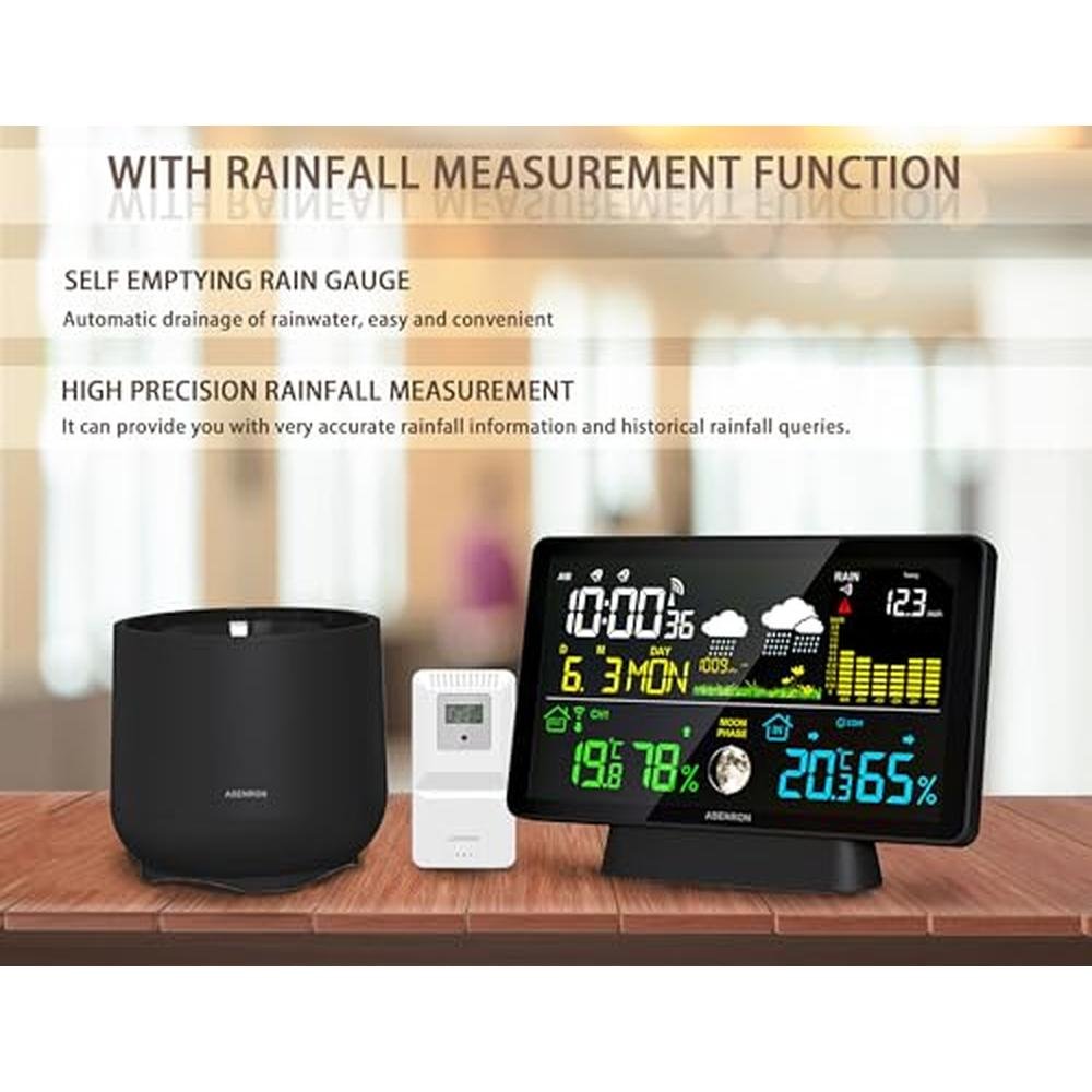 • Weather Station with Rain Gauge --- This multi-function weather station includes a self-emptying and maintenance-free wireless rain gauge, setting it apart from other weather stations. This feature allows for accurate measurement of rainfall, keeping you informed about precipitation levels around your home. Monitoring rainfall enables optimal watering schedules and helps identify potential flood and hazardous driving conditions.