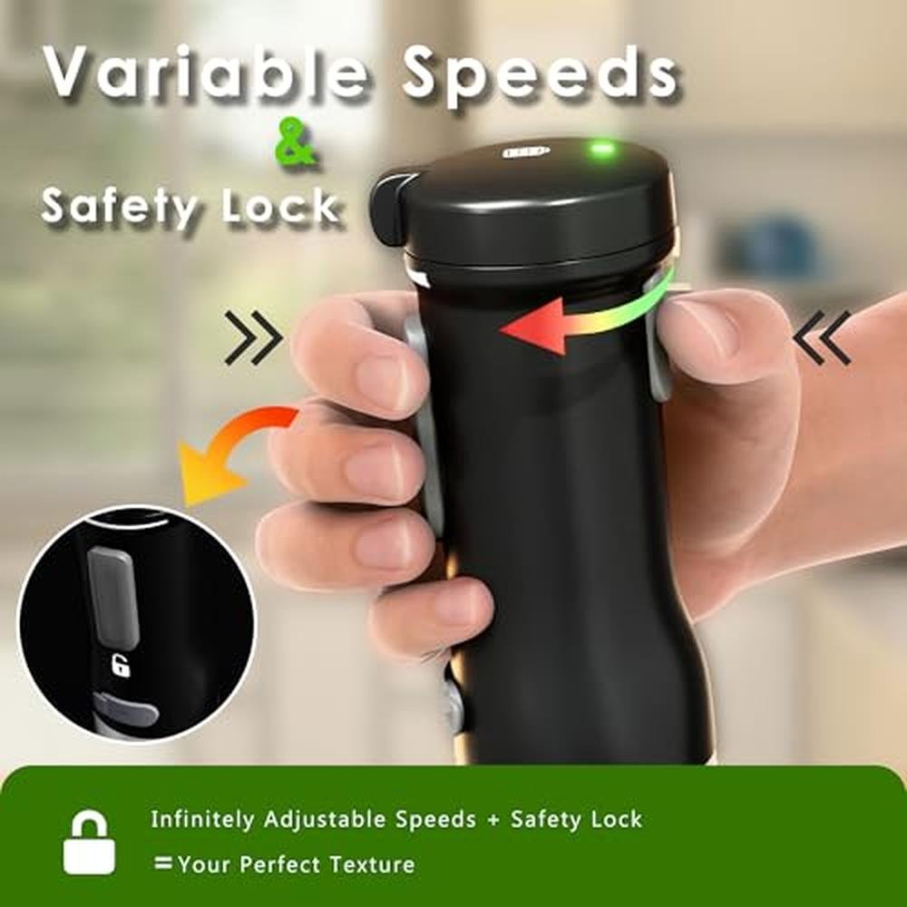 Your All-in-One Kitchen Solution This isn't just a blender - it's a complete kitchen toolkit. The 5-in-1 design includes a 700ml beaker for smoothies and sauces, an 800ml chopper for nuts, vegetables, and meats, a whisk for perfect batters, and a milk frother for barista-quality coffee. Each accessory is designed with your convenience in mind, saving you both time and counter space. Gone are the days of juggling multiple appliances; this immersion blender handheld does it all. Craft with Precision and Power The adjustable speed settings allow you to customize your blending experience, whether you're gently mixing delicate ingredients or tackling tougher tasks. Equipped with four sharp, durable blades, this hand blender delivers powerful performance for all your culinary creations.