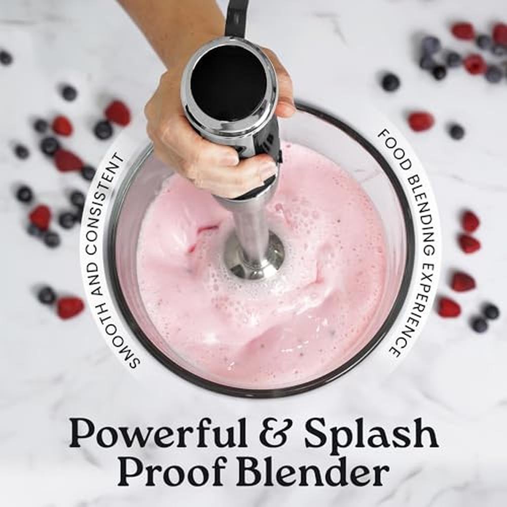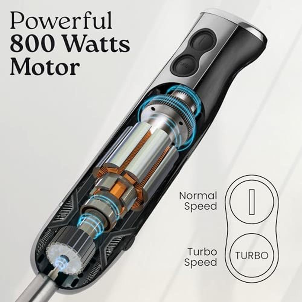 Introducing Zulay's immersion blender, a versatile and powerful hand blender designed to streamline your kitchen tasks. This emulsion blender handheld is equipped with a high-performance 800-watt motor, providing robust performance for a variety of tasks, including blending soups, mixing sauces, preparing smoothies, and making dips. The stick blender features multiple speed settings plus a turbo mode function, allowing you to easily adjust the power of this handheld blender to suit different ingredients and recipes. The stainless steel blades of this emulsifier are engineered for smooth and efficient blending, while minimizing splatter to keep your kitchen clean. The ergonomic handle of this hand-held blender is designed for comfort, reducing hand fatigue and providing a secure grip during use.