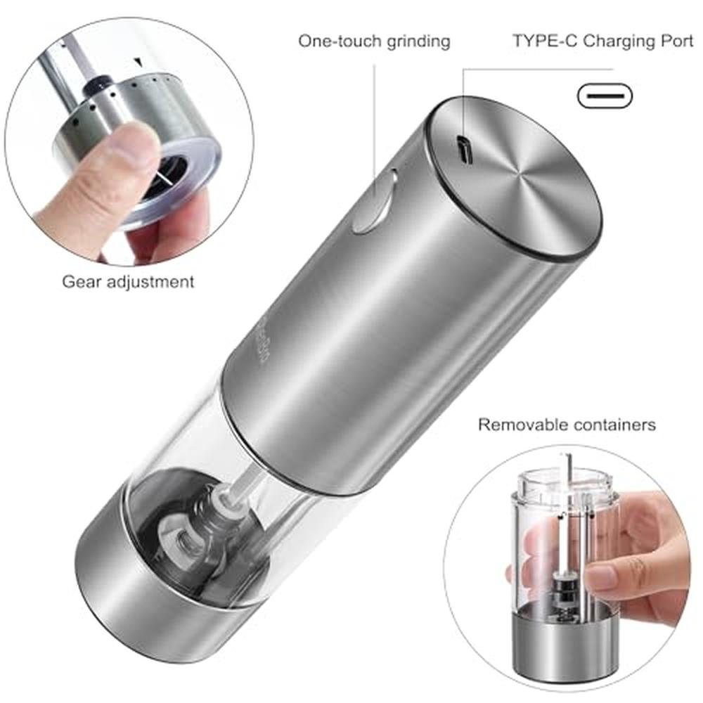 Elevate your cooking experience and kitchen beauty with our refillable salt and pepper grinder set, perfect for gift-giving or personal use. This thoughtful gift is ideal for friends, family, and loved ones. Backed by a one-year warranty, our mini salt and pepper grinder set comes with a Type-C quick charger, eliminating the need for batteries.