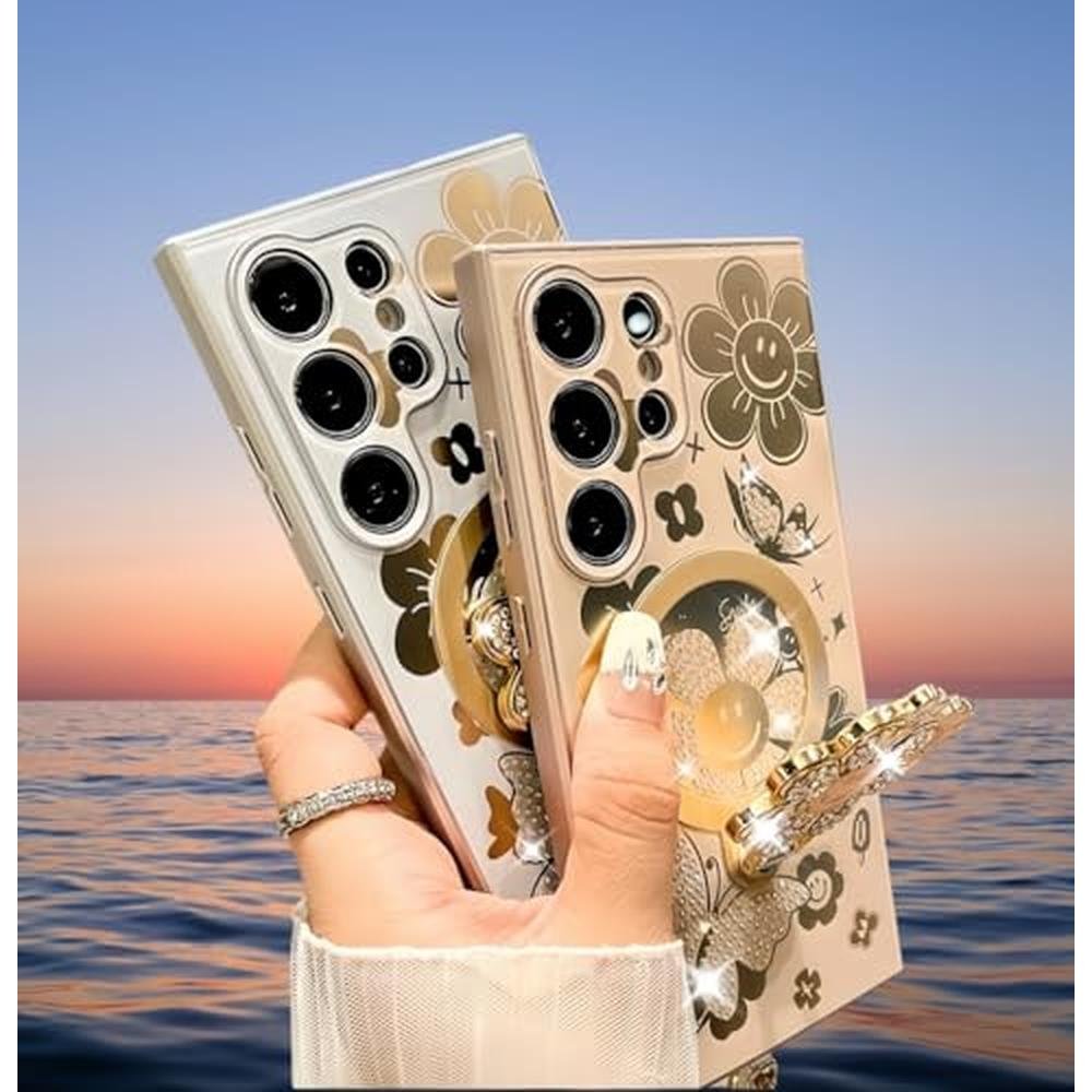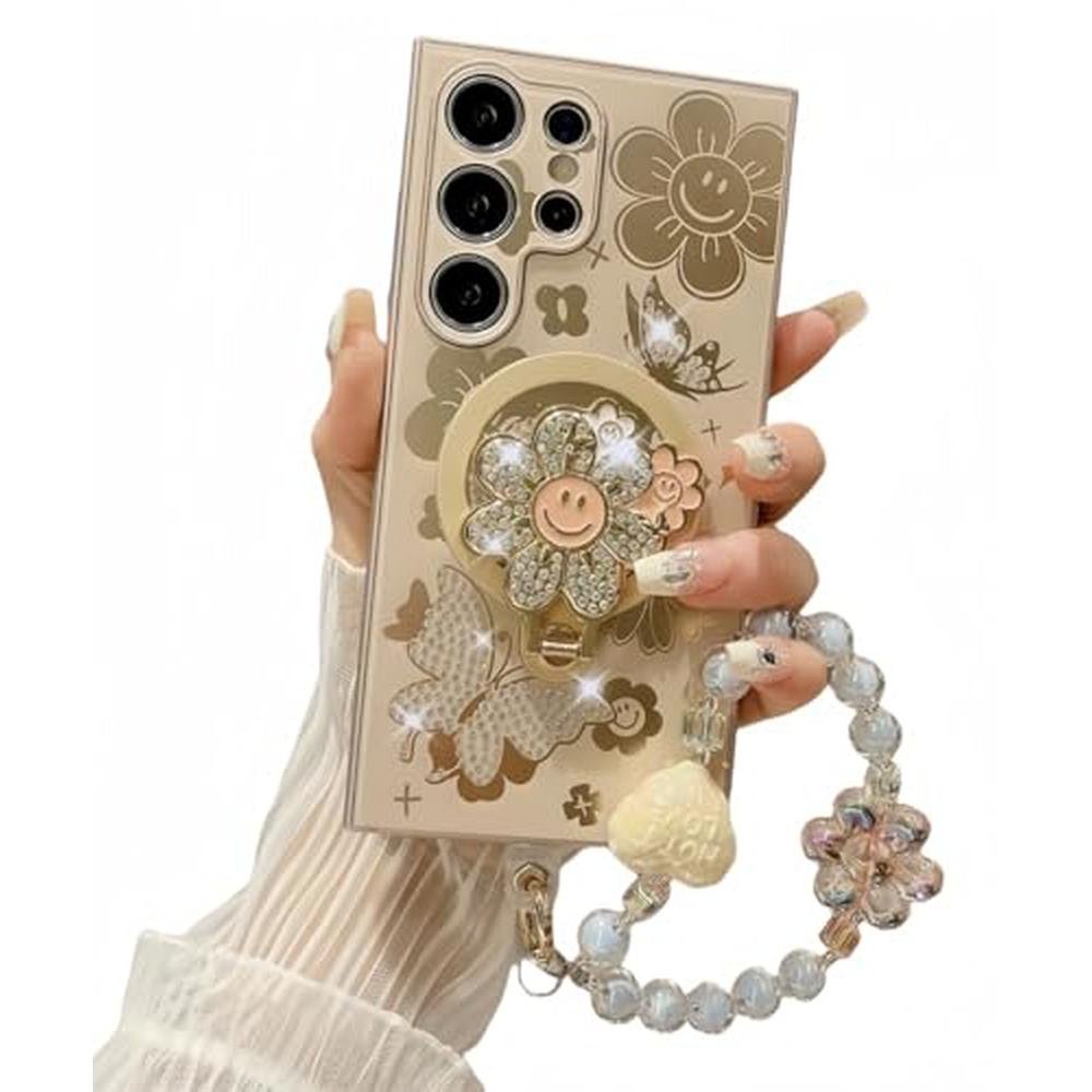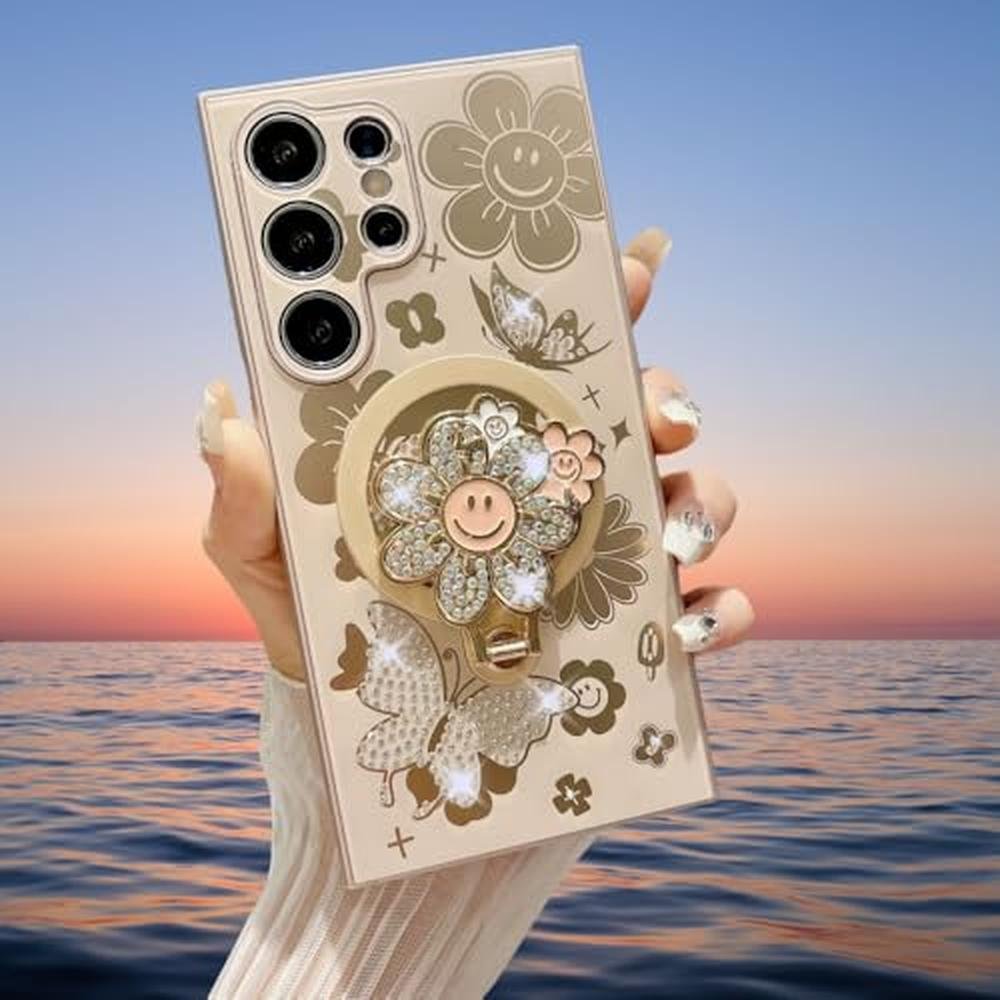 - Samsung S25 Ultra 5G Case Glitterstylish shiny rhinestone butterfly design combined with smile floral kickstand function, not only brings a kind of fashion beauty but also makes your phone more vivid and adorable,super funny to use in daily life