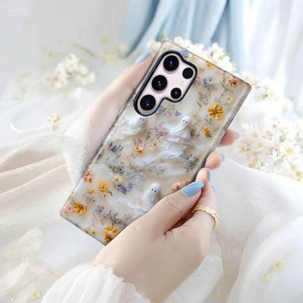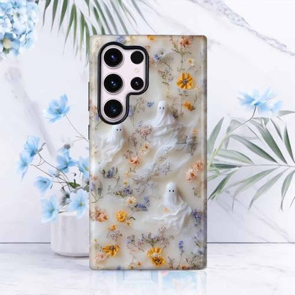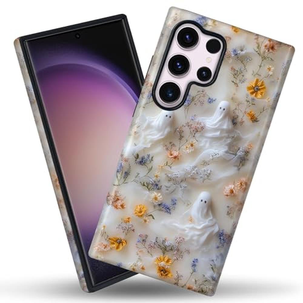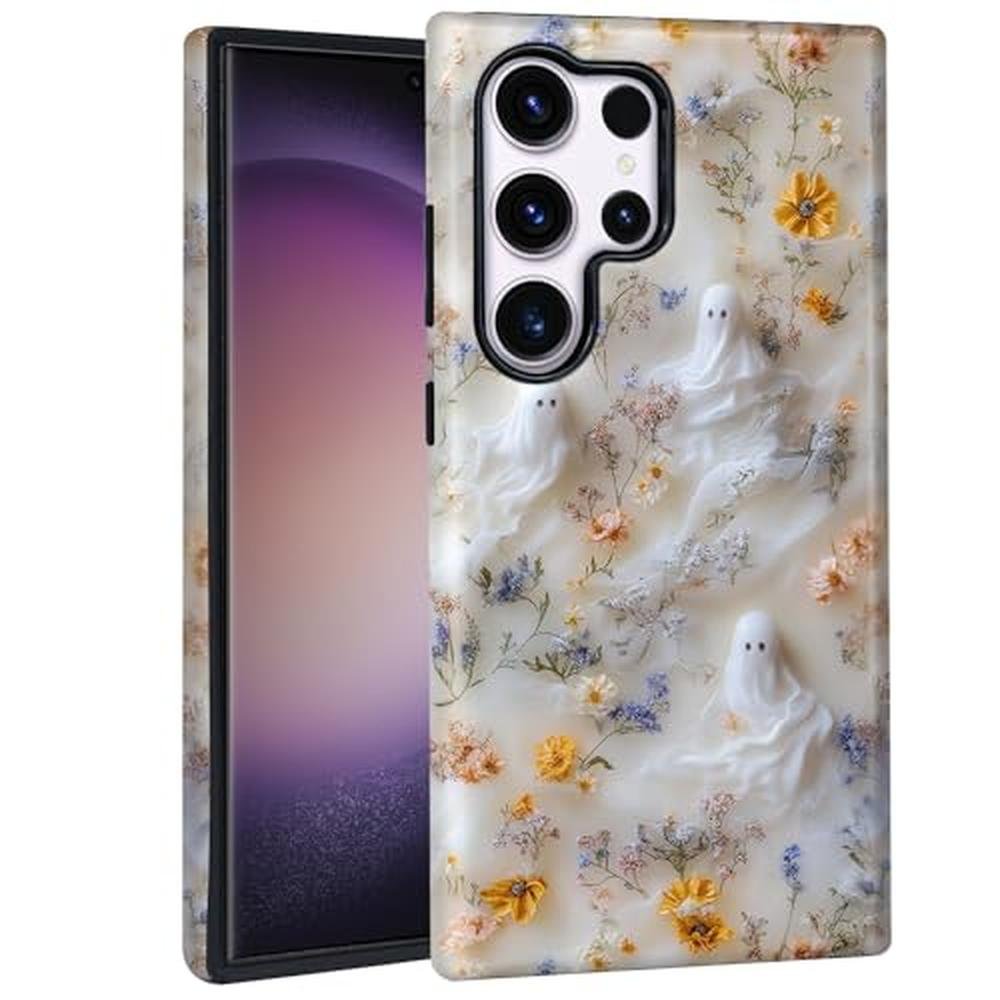 Mainrenka Halloween Ghost Case for Samsung Galaxy S25 Ultra, Aesthetic Cute Flower Skull Phone Case Hybrid 2-Layer Hard Shell Shockproof Design Protective Cover