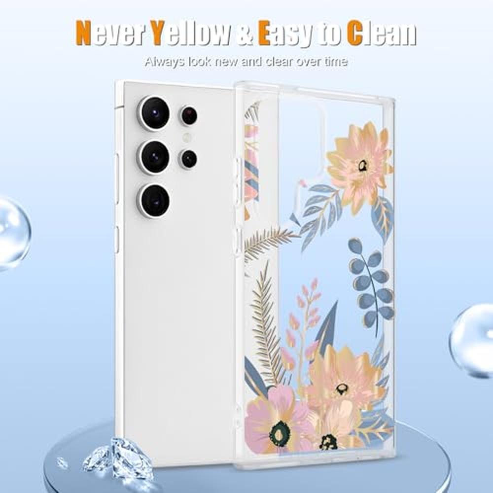 Pepmune Fit for Samsung Galaxy S25 Ultra Case Floral, Cute Clear Flower Cover for Women Girls Elegant Soft Transparent Luxury Gold Plated Shockproof Phone Case for Samsung Galaxy S25 Ultra, Blossom
