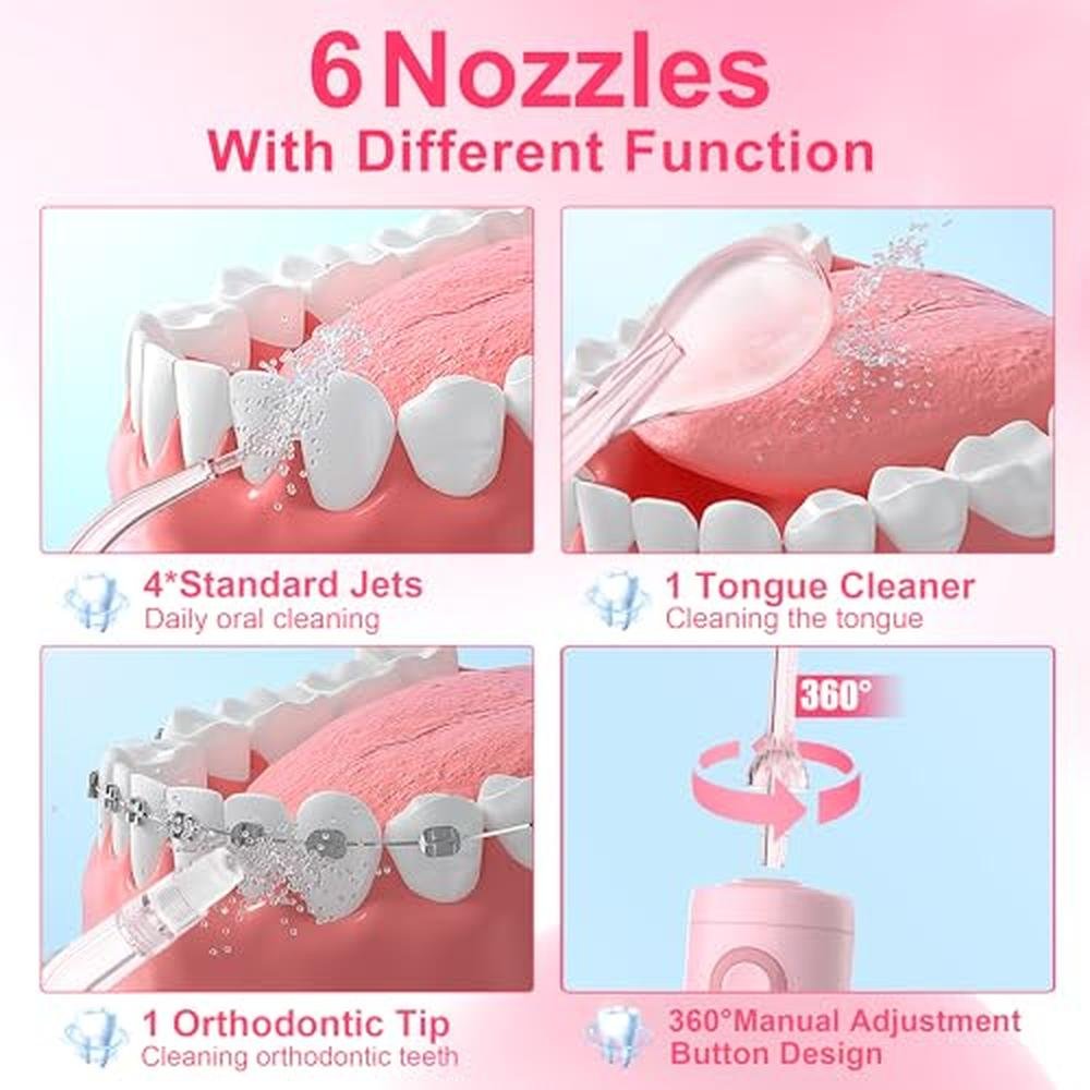 - Complete Family Oral Care Solution Our Electric Water Flosser takes oral hygiene to the next level with its set of 6 nozzles catering to diverse needs within your family. The 360 rotatable nozzle design guarantees thorough cleaning even in those hard-to-reach places. For optimal hygiene, we recommend changing the nozzle every three months.