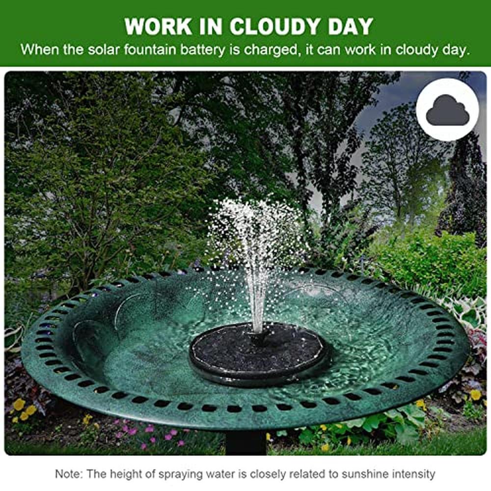- Work in Shadow: Built-in 2000 mAh Battery, the solar fountain can work in cloudy day; After 2-3 hours fully charging, the solar fountain can work for 4-6 hours; Usually, the solar water fountain should be put in direct sunlight to work and charge; If the bird bath fountains solar power stop working in cloudy day, it may the battery runs out or the water pump is blocked