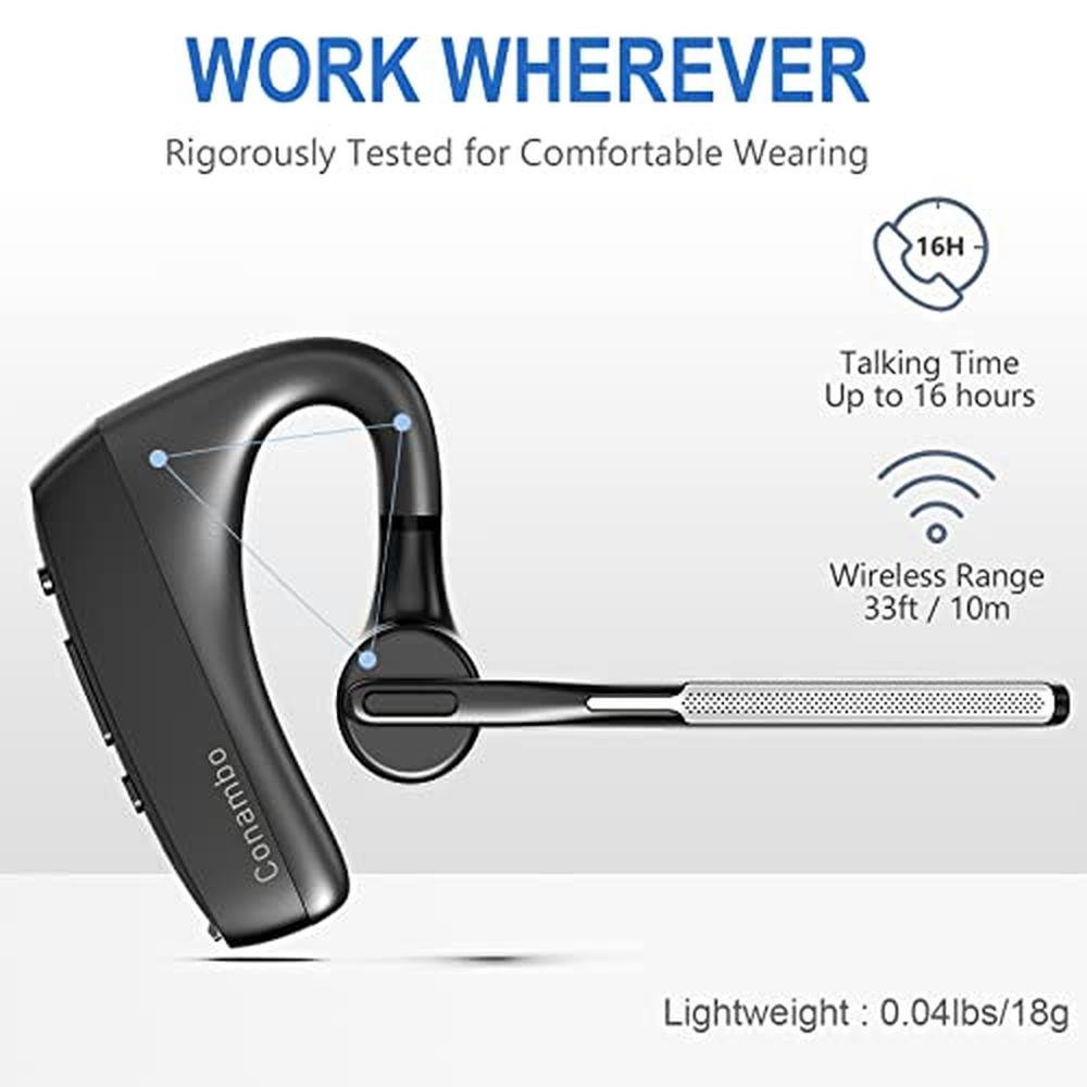 Experience unparalleled audio clarity and convenience with the CONAMBO Bluetooth Headset V5.1, expertly designed for seamless hands-free communication on your cell phone, iPhone, or Android device. With an impressive 16 hours of HD talktime, this CONAMBO Bluetooth headset ensures you stay connected throughout the day, whether you're driving, in the office, or on-the-go. Equipped with advanced CVC8.0 dual mic noise cancelling technology, this bluetooth CONAMBO earpiece effectively reduces background noise, allowing for crystal-clear voice calls and an enhanced listening experience. Simple to pair and use, the CONAMBO Bluetooth headset is perfect for business professionals, drivers, and anyone seeking a premium, high-end audio solution. The adoption of latest Bluetooth 5.1 technology enables faster, more efficient, and stable transmission, with a range of up to 59 ft (18 m) and multipoint technology for connecting up to two devices at once. Compatible with a wide range of devices, including iPhone, Android, tablets, laptops, and other leading smart phones, this CONAMBO Bluetooth headset is the ultimate choice for those seeking a sophisticated, top-tier audio experience. With CVC8.0 Dual mic noise cancelling and ENC technology, this headset knocks out 96% noise and delivers clear voice, while Echo Cancelling and Consistent Voice Quality technology ensure clearer calls and consistent voice quality even in situations where bluetooth connectivity may be compromised. Enjoy ultra-long battery life with up to 12-16 hours of continuous talking on a 1.5 hours single charge, and experience the convenience of hands-free communication with Microsoft Teams, Skype, Zoom, and other leading collaboration and voice platforms. The sleek and pocket-size design of the K18 headset makes it perfect for on-the-go communication, while the comfortable design, rigorously tested for stability and comfort on a wide range of ear shapes, ensures that you'll feel just as comfortable during your first call as your last call. With 9Pcs different sizes ear tips to meet your need, this CONAMBO Bluetooth headset is the perfect choice for anyone seeking a premium, high-end audio solution that combines advanced technology, sophisticated design, and exceptional comfort.
