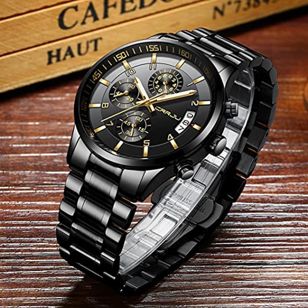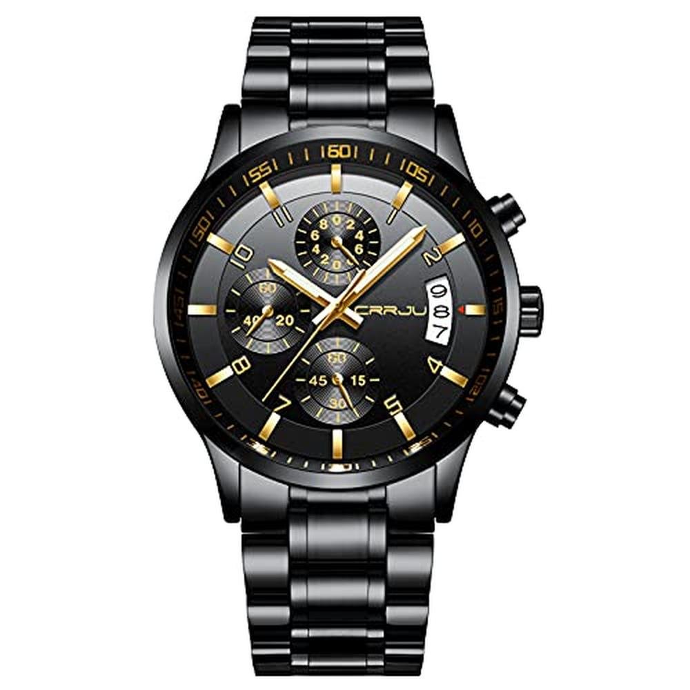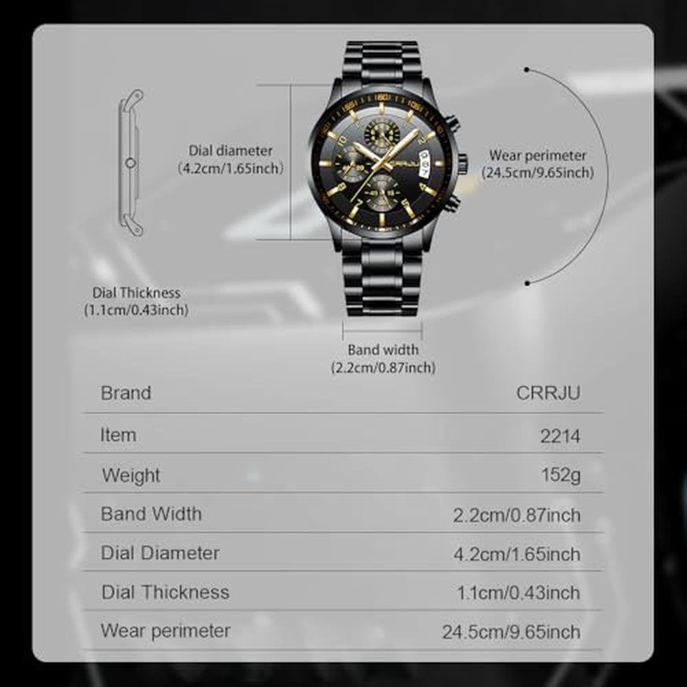 Experience the pinnacle of luxury and style with CRRJU Watches for Men, a perfect blend of fashion and functionality. Our premium stainless steel watches boast a high-quality Japan Movement and are waterproof, making them ideal for business and casual wear. With a sleek black and golden design, these quartz wristwatches are sure to turn heads. If you're looking for affordable luxury, explore our collection to find the perfect timepiece that fits your budget. Discover why we're the top choice for luxury watch enthusiasts by reading our reviews and customer testimonials.
