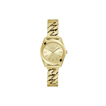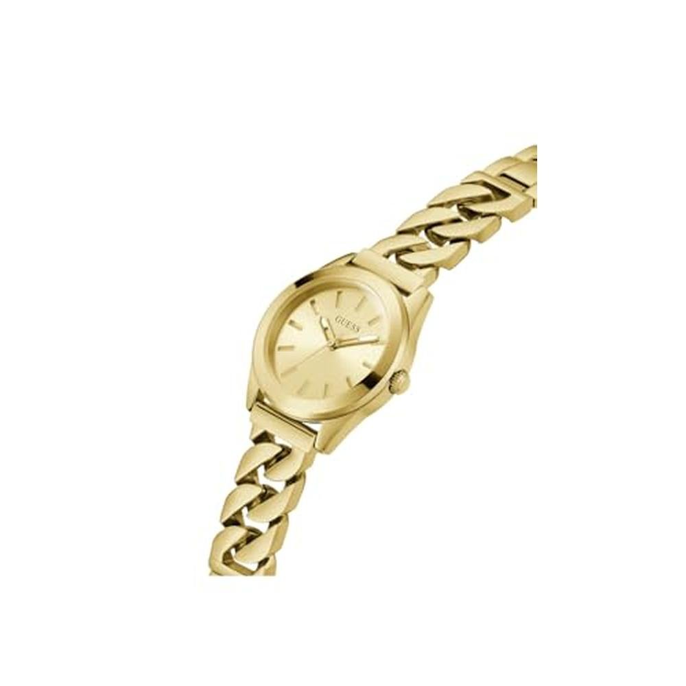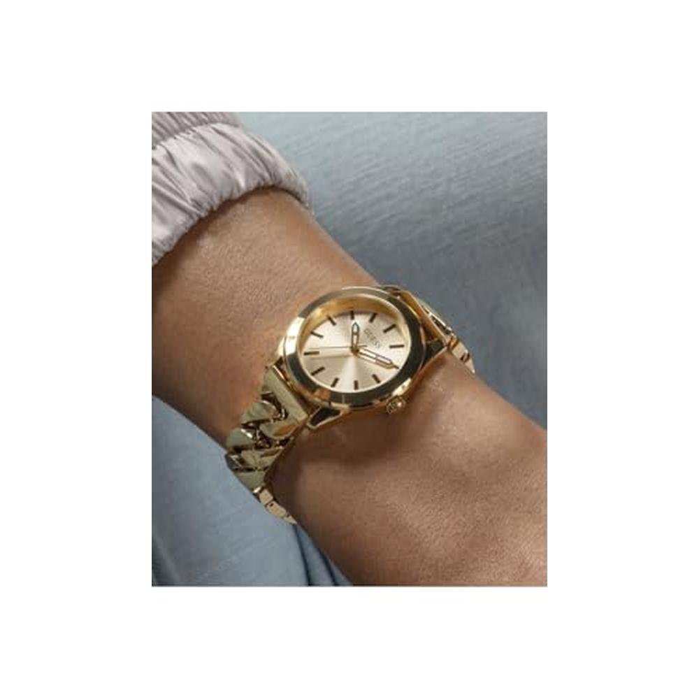 Indulge in the luxury of the GUESS Women's 32mm Watch, a true symbol of elegance and refinement. This stunning timepiece is designed to make a statement, with its gold tone gold tone case and champagne dial that shines like gold.