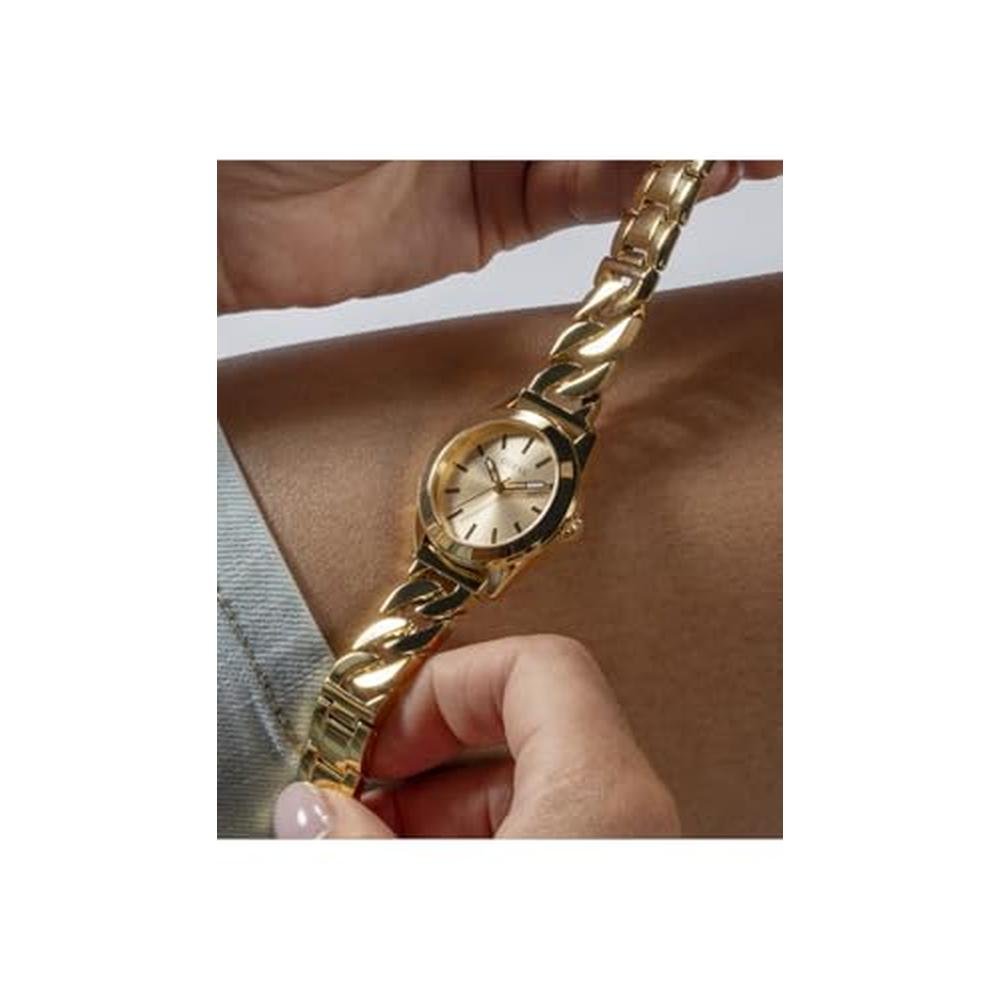Step into the world of luxury watches and experience the GUESS Women's 32mm Watch, a true symbol of elegance and refinement. This stunning timepiece is designed to make a statement, with its gold tone gold tone case and champagne dial that shines like gold.