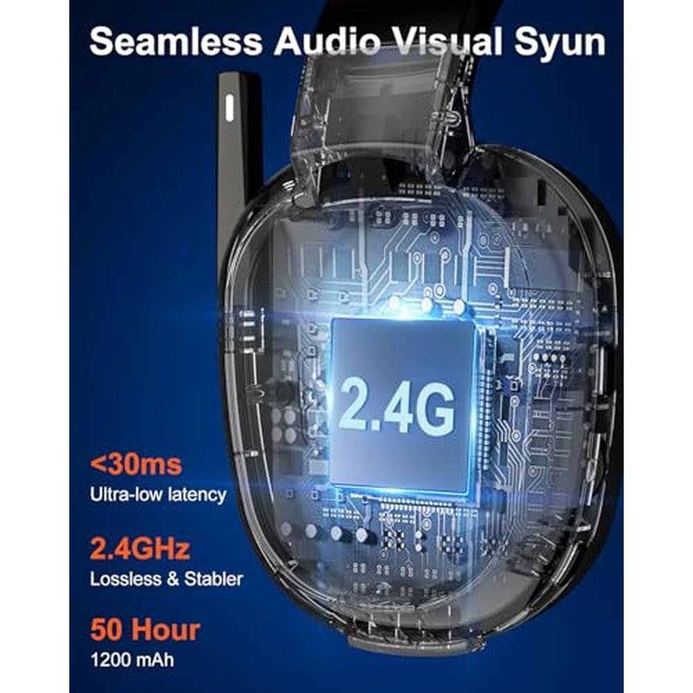 - Ergonomic Design & Long-lasting Battery Life : The wireless headset with mic features a fabric suspension headband that not only reduces head pressure well, but also fits a variety of head shapes. Your ears are fully covered by soft, breathable memory protein earmuffs that isolate noise and prevent fatigue during long gaming sessions. The wireless gaming headphones with mic is powered by a massive 1200mA battery, which only needs to be charged for 3 hours to achieve up to 50 hours of gaming time.