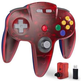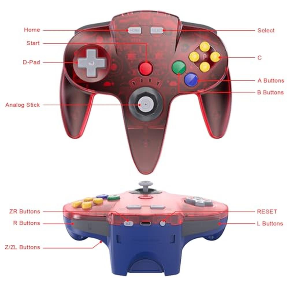 2.4 GHz Wireless Technology 2.4 GHz wireless connection and wireless range up to 25-foot that is better than having to sit on floor a foot away from the TV Ergonomic Comfort Classic N64 style with "M" shape ,perfectly fit palms, all the buttons and controls make your hand very comfortable for long periods of gaming The controller is rechargeable and charges with USB C Built-in 500mah high-performance lithium batteries and only takes 3 hours to charge and can work for up to 20 hours and more. Great controller for N64 replacement Accurate stick and all the buttons work easy to pair, this is a good chioce for most retro games. Package List 1x Wireless Game Controller 1x User Manual 1x USB Charge Cable 1x N64 Receiver 1x USB Receiver