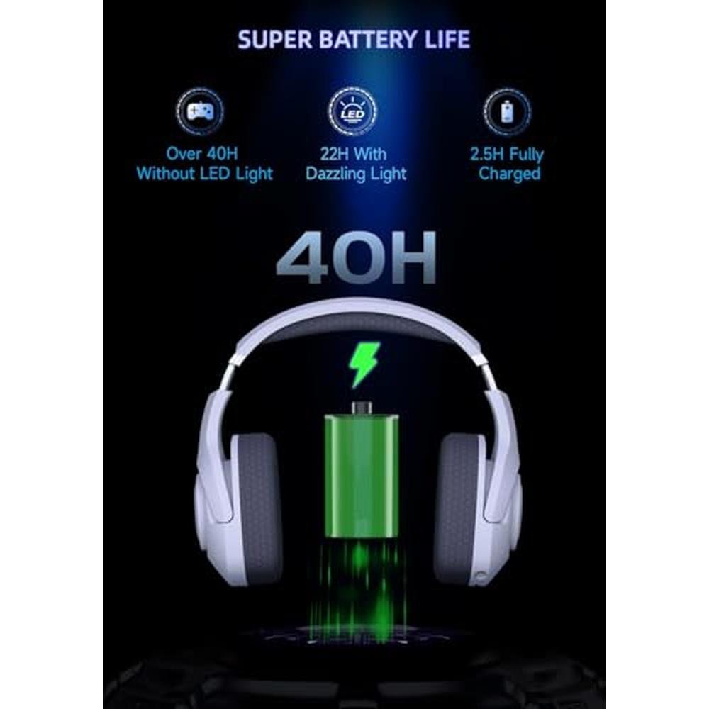 - FAST CHARGING & LONG BATTERY BATTERYKAPEYDESI Have more longer gaming sessions with the Wireless Gaming Headset boasting 40+ hours of battery life. LED mode allows up to 25 hours of use, with the option to disable lights anytime. Get voice prompts when power falls below 3%. Charging the Bluetooth gaming headset fully takes only 2.5 hours.