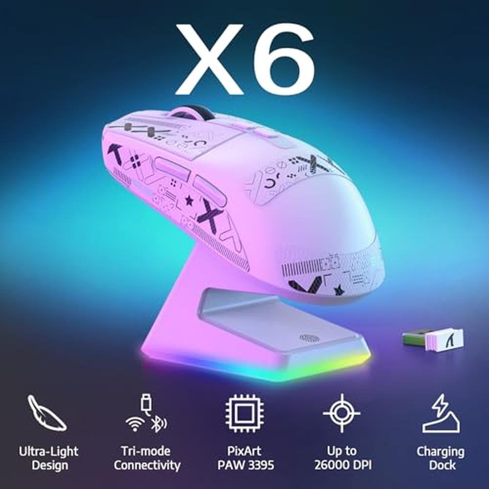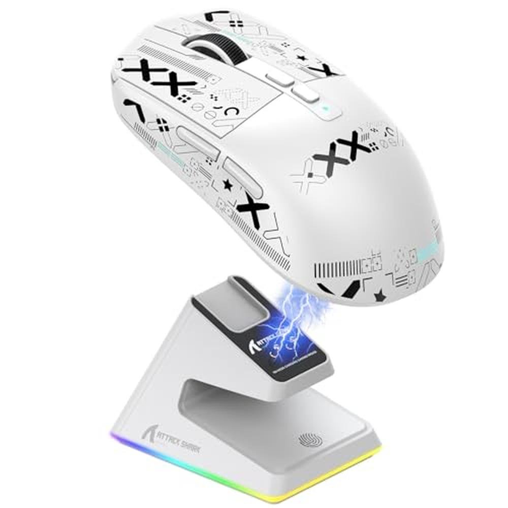 ATTACK SHARK X6 49g Superlight Wireless Gaming Mouse with Magnetic RGB Charging Dock,BT/2.4GHz Wireless/Wired Mouse,PixArt PAW3395 Sensor, 26000DPI, Griptape, 200Hrs Battery for Win/Mac (White)