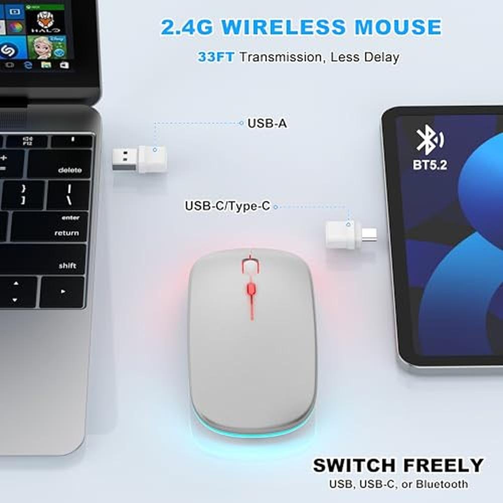 Mouse iPad | Azmall Bluetooth Wireless Mouse Slim LED Rechargeable Silent Mouse | 2.4GHz USB-A/USB-C Receiver Type-C Adapter Compatible with Laptop MacBook iPad iPad Pro Mac Tablet Grey
