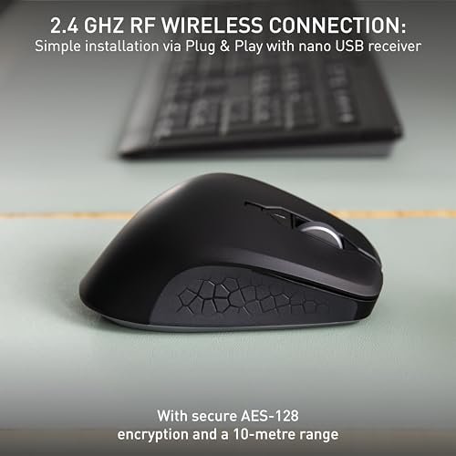 The Cherry Stream Mouse Comfort boasts state-of-the-art 2.4 GHz wireless technology, a generous range of up to 10 m, and a high-quality metal scroll wheel for a premium tactile experience. The ergonomic design, specifically crafted for right-handed individuals with medium to large hands, promotes a natural and relaxed hand posture. The mouse also features a handy thumb rest with an attractive Voronoi pattern, generous sliding surfaces for smooth navigation, and a clever dongle holder for convenient storage. With a resolution of up to 4000 dpi and a 4-step adjustable dpi switch, you can enjoy absolute precision and control. The long-lasting battery life of up to 16 months, combined with a flashing LED indicator and on/off switch, ensures uninterrupted use. The free CHERRY KEYS software allows for customizable mouse settings, providing an optimal user experience.