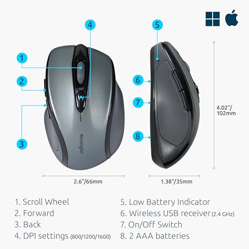 Kensington Pro Fit Mid-Size Wireless Mouse | Graphite Gray K72423AM | Ergonomic Design