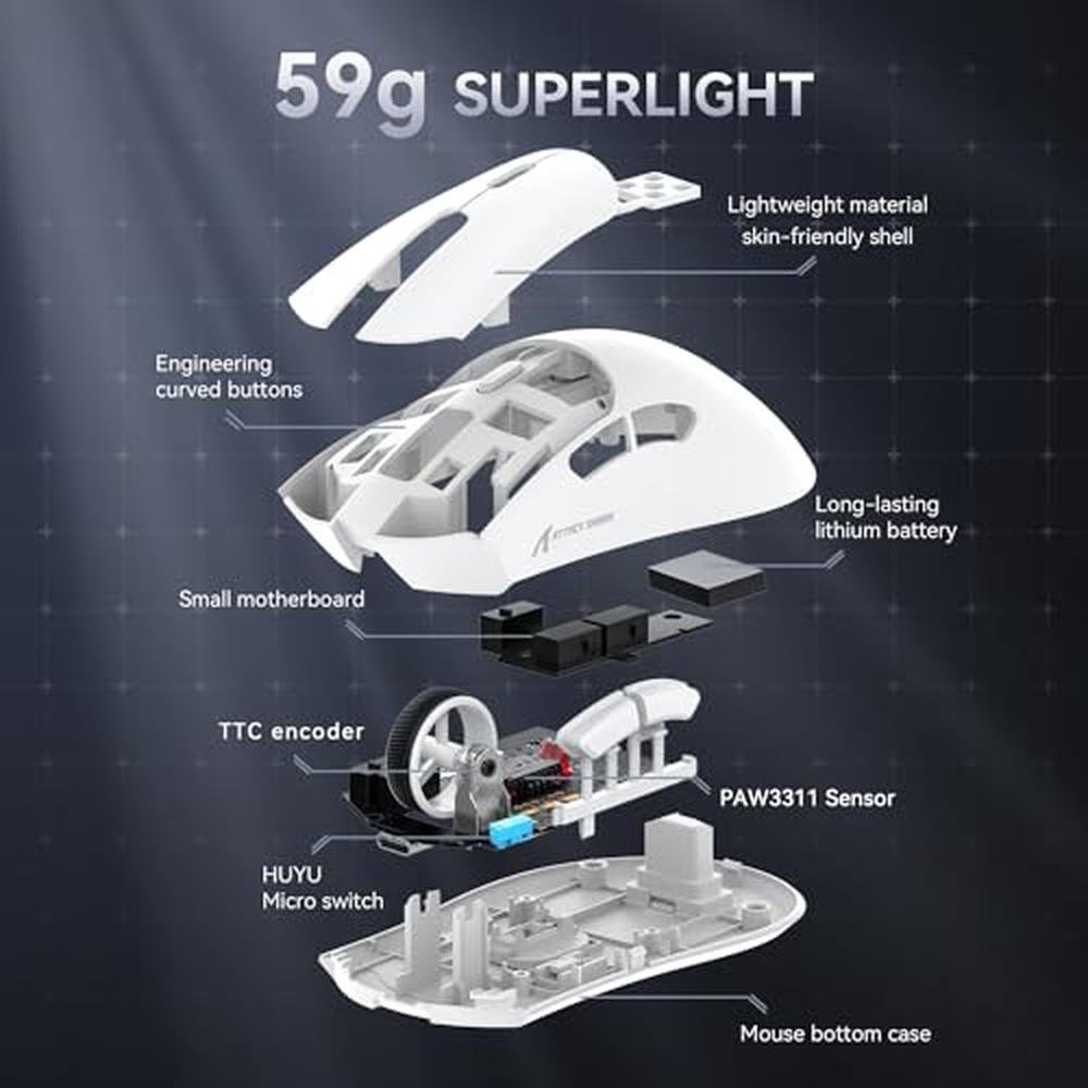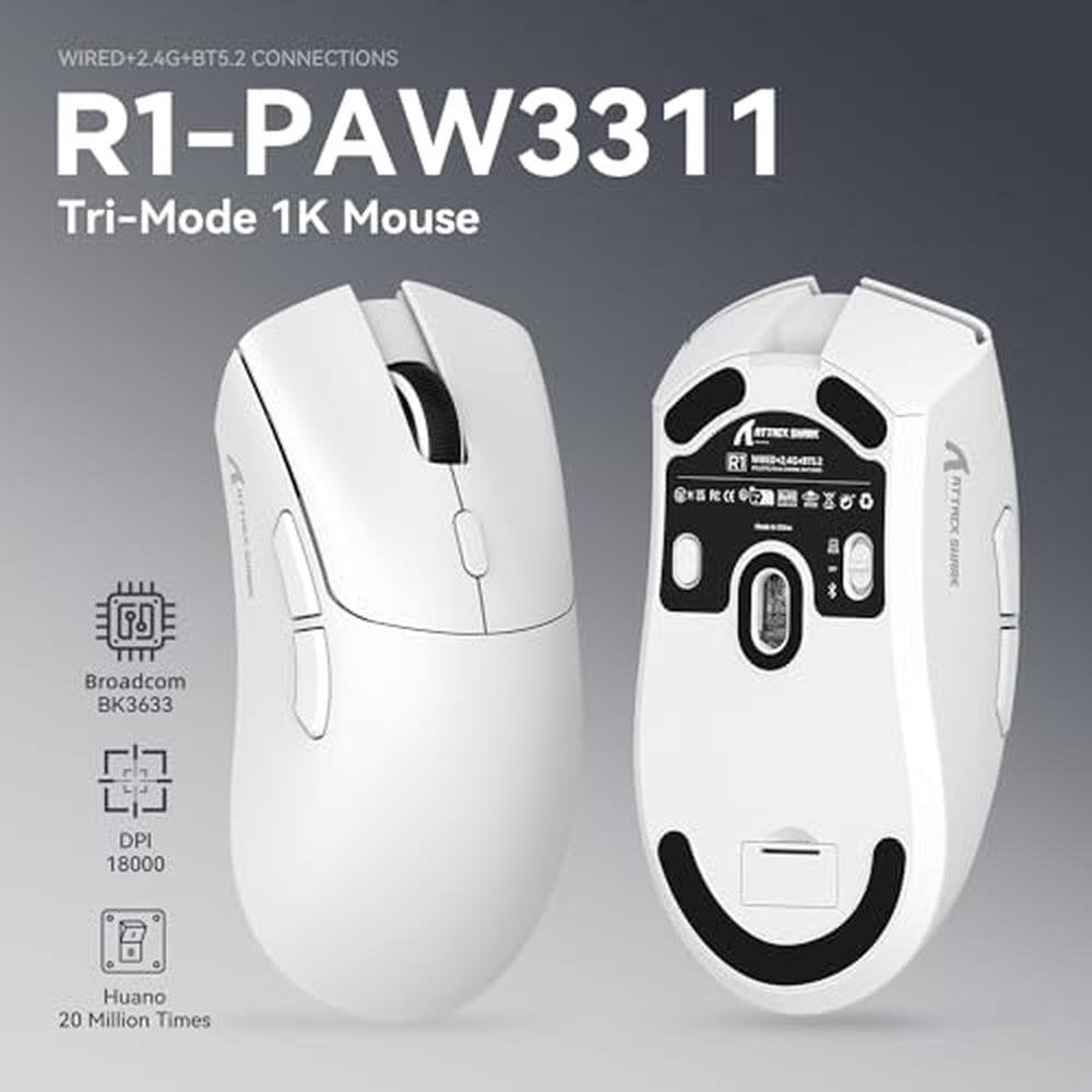 MAMBASNAKE Attack Shark R1 Wireless Gaming Mouse,PAW3311 Optical Sensor 18K DPI,59g Ultralight 2.4Ghz/BT/Wired Computer Mice for Win/Mac - White