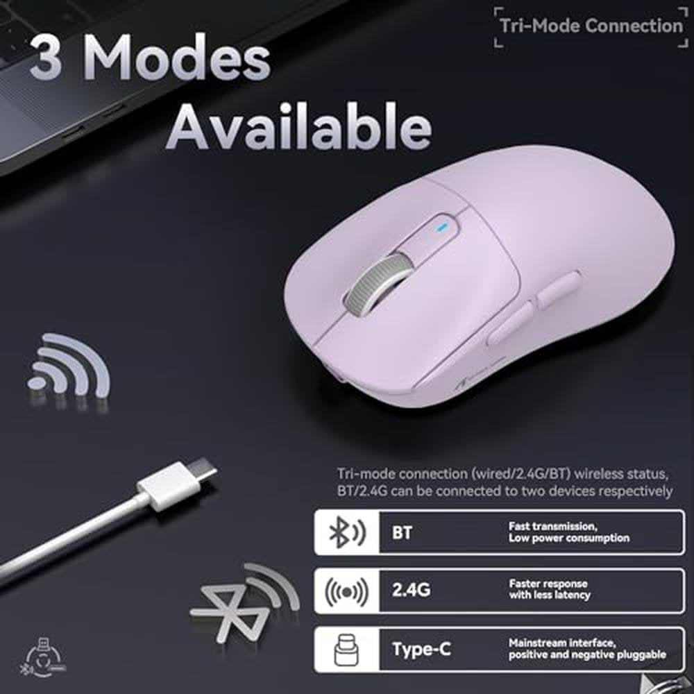 - 3 Modes ConnectivityEnjoy three connectivity options with the X3 wireless mouse lag-free 2.4 Ghz mode for lightning-fast performance, Bluetooth 5.2 for seamless pairing with various devices, and wired mode with the ultra-flexible Type C charging cable. The package includes a 1.6m long paracord cord.