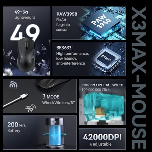 Immerse yourself in the world of high-performance gaming with the MAMBASNAKE Attack Shark X3MAX Wireless Gaming Mouse, expertly crafted to deliver unparalleled precision and speed. Equipped with the cutting-edge PixArt PAW3950 sensor, this premium mouse boasts an impressive 42000 DPI, ensuring accurate and swift cursor movement. Weighing in at just 49g, the X3MAX is an ultralight tri-mode mouse, offering seamless connectivity via BT5.4, 2.4GHz, or wired modes. With a rapid 1K polling rate and programmable features, this sophisticated computer mouse is perfect for discerning PC, MAC, and Win gamers seeking a competitive edge. As part of the esteemed MAMBASNAKE Attack Shark series, the X3MAX redefines the gaming experience with its exceptional performance, elegant design, and advanced features.