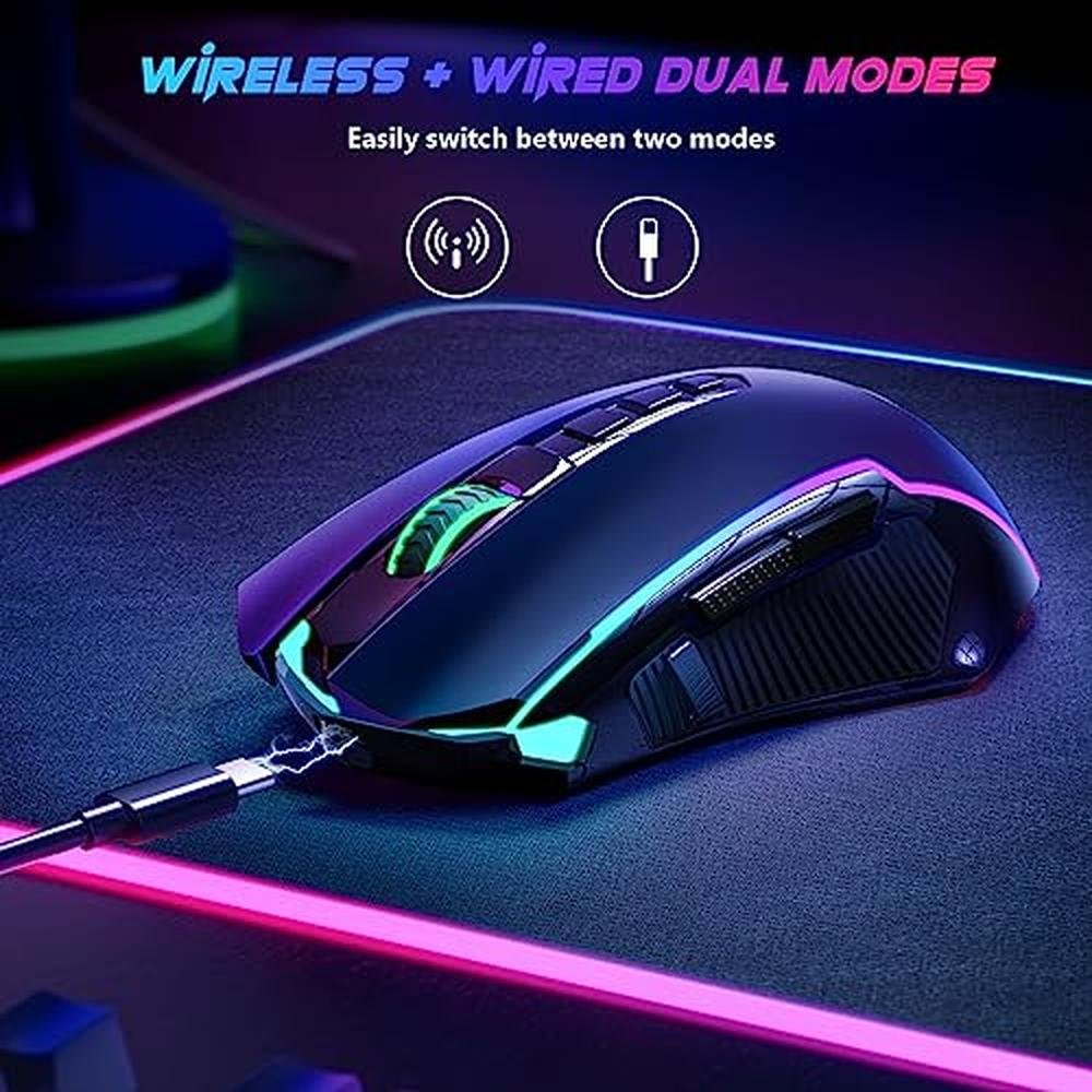 • Powerful Battery LifeThe rechargeable mouse has a long battery life between 35 hours (RGB on) and 70 hours (RGB off) on a single charge, providing you with nonstopping use. It will auto-sleep after 1 minute of inactivity for power saving. The wireless mouse gaming also can be used while charging.