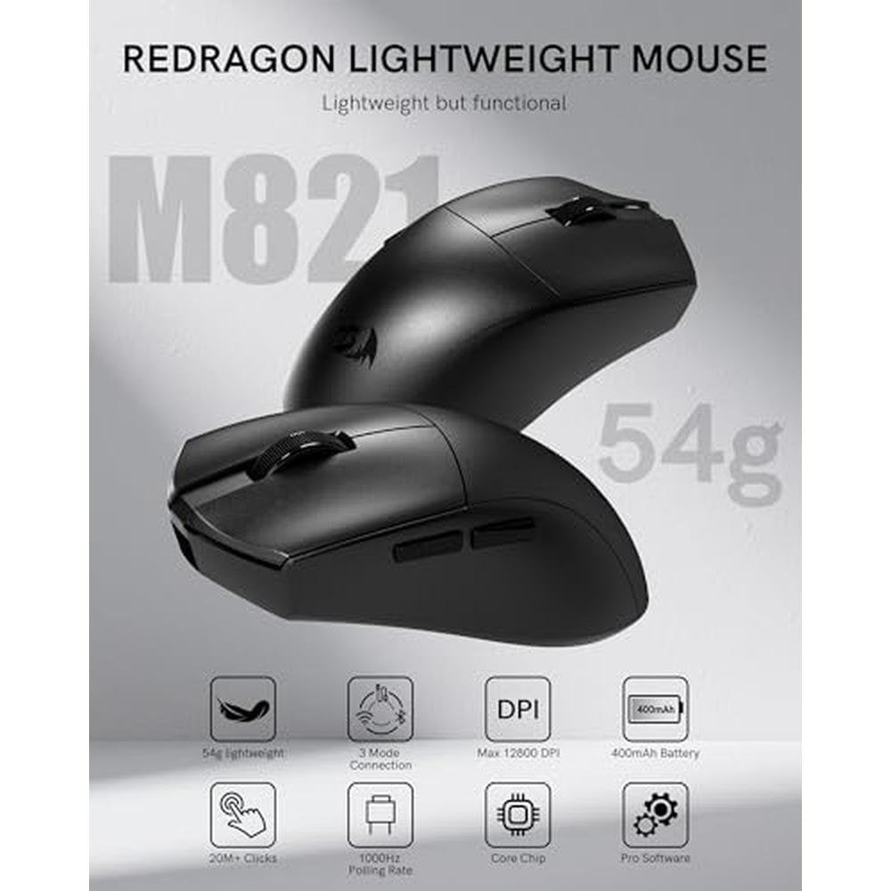 Redragon Wireless Gaming Mouse, 54G Lightweight, Tri-Mode 2.4G/USB C Wired/Bluetooth, Black PC Gaming Mice for Computer Laptop Mac Windows, Max 128000 DPI, 1K Polling, 6 Programmable Buttons, M821