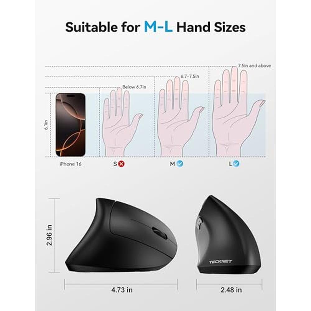 - PERFECT FOR MEDIUM TO LARGE HANDS: The TECKNET wireless ergonomic mouse is designed for medium to large right hands, this vertical mouse measures 4.73 x 2.96 x 2.48 inches (12 x 7.5 x 6.3 cm). For optimal comfort, we recommend measuring your hand prior to purchase (see product image for guidance)
