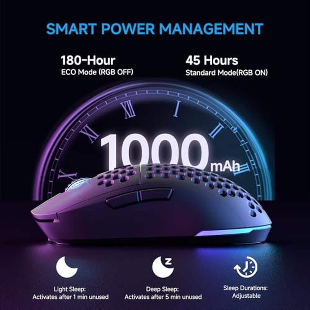 - Long 180Hr Smart Power + Rapid USB-C Recharge: 1,000mAh rechargeable battery powers 180hrs runtime (ECO Mode) or 48hrs (RGB Mode). Fully recharges via USB-C in 1 hour. Smart auto-sleep: 1min idle light sleep (wake via movement) / 5min idle deep sleep (wake via button). Sleep timers adjustable via driver for personalized power management.