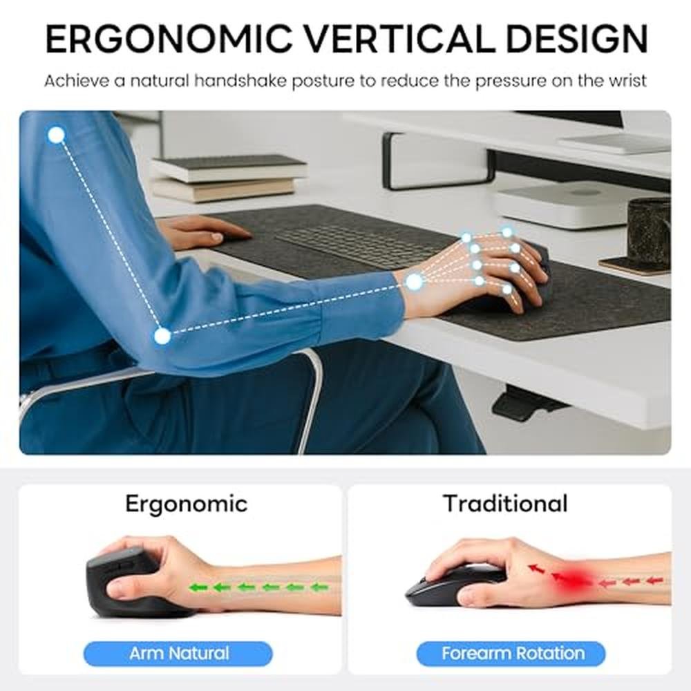 Uineer Ergonomic Wireless Mouse,Bluetooth Vertical Mouse with BT5.0/4.0/2.4G, Rechargeable with Battery Indicator,Ergonomic Design for Comfort and Reduced Wrist Strain for Home,Office Use,Black