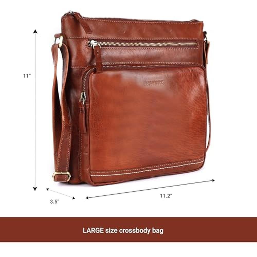 Lederbuck Olga | Women's Extra-Large Genuine Leather Crossbody Purse Soft Triple Zip Shoulder Bag Cognac | Premium Handcrafted Luxury
