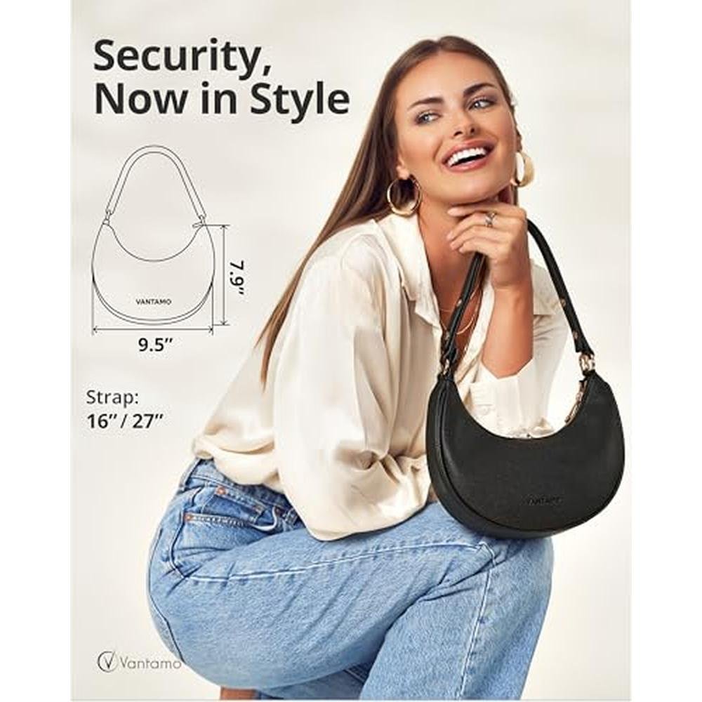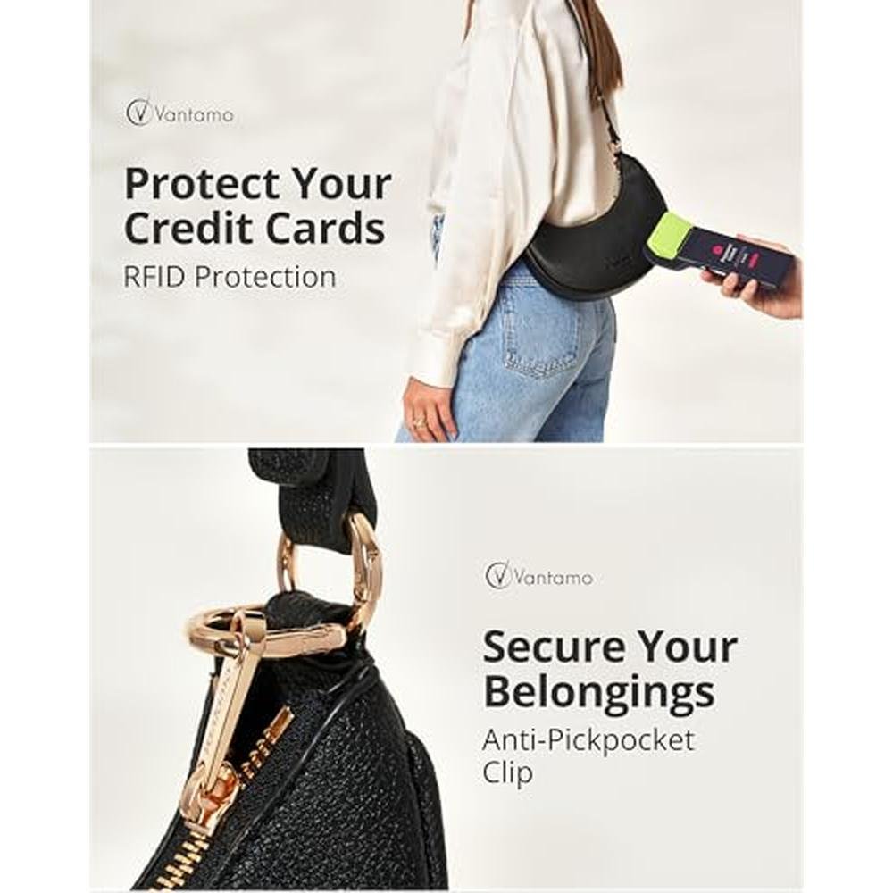 - Discover the perfect blend of style and security with Vantamo Crescent Bags, featuring RFID protection and an anti-theft clip for added peace of mind