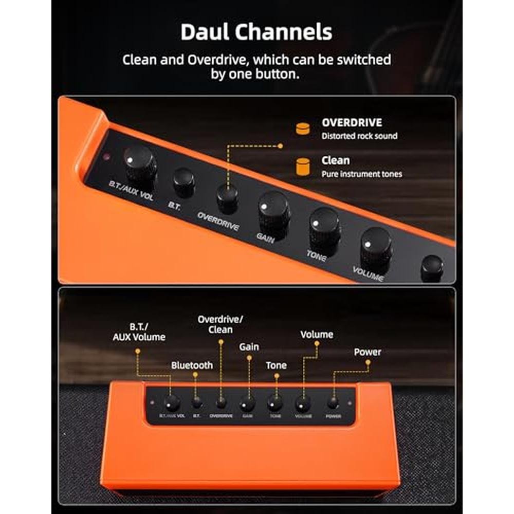 - Two Tone Channels: LEKATO GA-02 Mini Guitar Amp has two effect channels(Clean/Distortion), which can be switched by one button. You can choose different tones by adjusting "GAIN" and "TONE" to play different styles of music. You can adjust the VOLUME knob to adjust your desired volume.